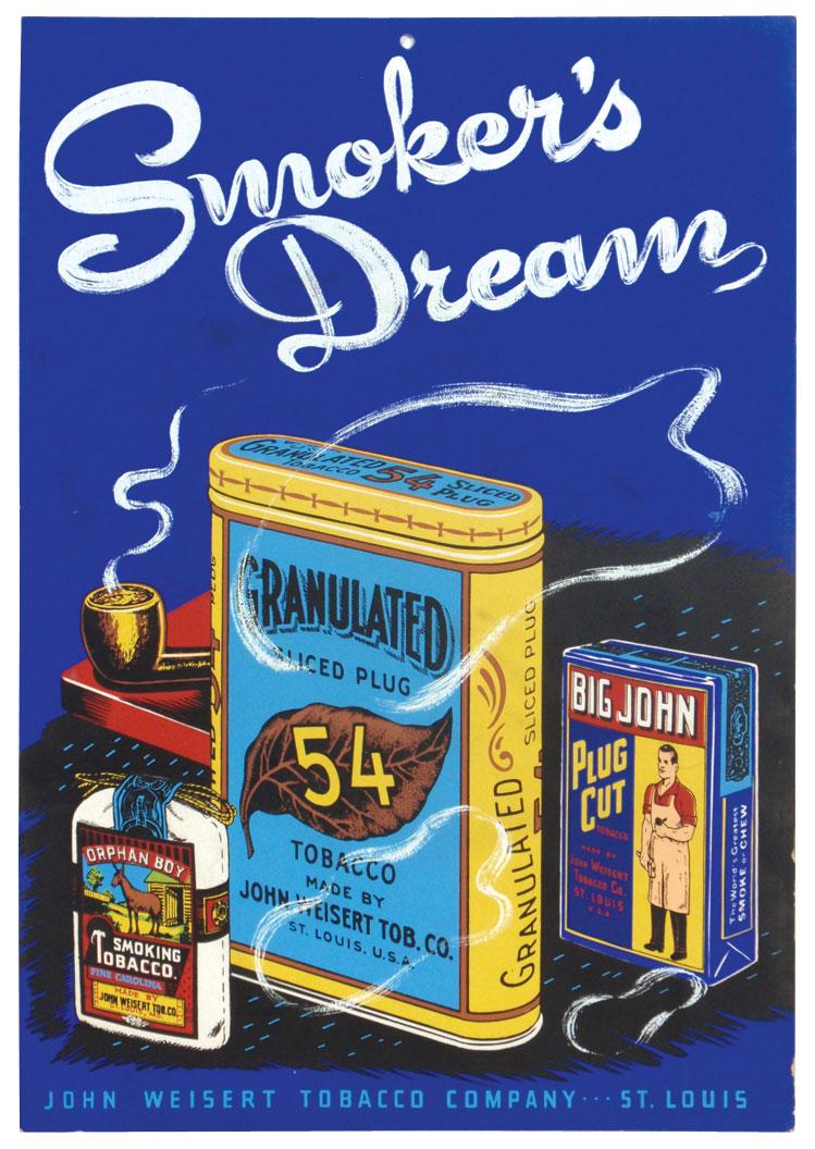Tobacco sign, Smoker's Dream w/Orphan Boy, Big John & Granulated Sliced Plug graphics, colorful litho on cdbd from the John Weisert Tobacco Co-St. Louis, Exc cond, 19.5"H x 13.5"W.