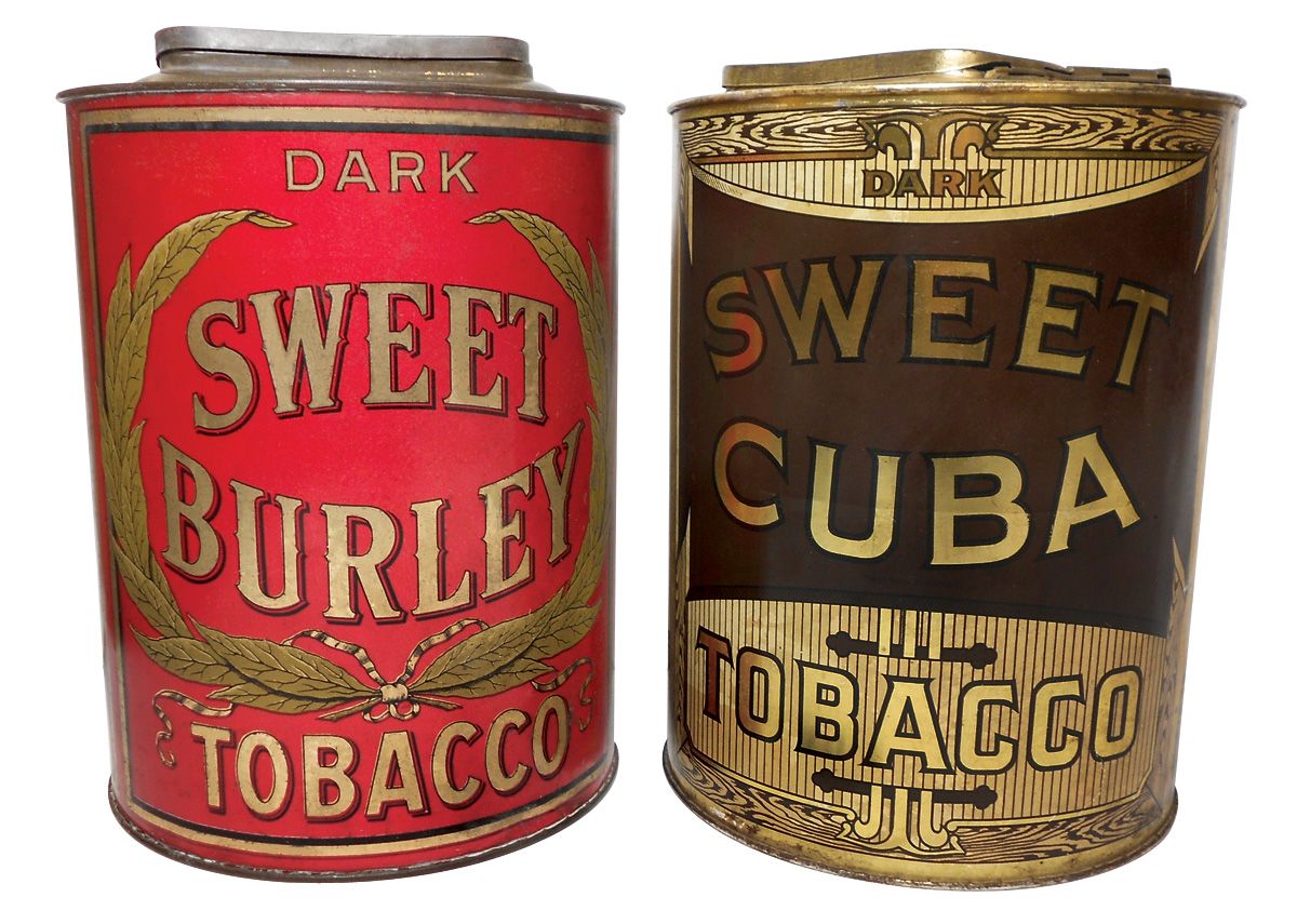Tobacco tins (2), Sweet Cuba & Sweet Burley, both w/hinged lids, both in VG/Exc cond & 11.5"H.