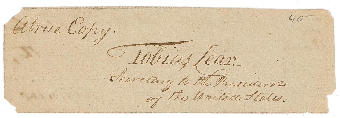 Ink signature, “Tobias Lear,” on an off-white 5.5 x 1.75 slip, with notations in another hand above and below signature. Uniform toning, a bit of scattered light soiling, and light show-through from writing on reverse, otherwise fine condition.