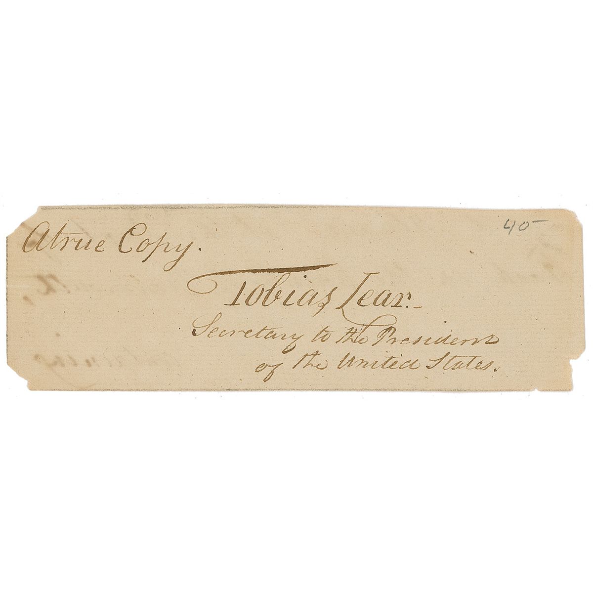 Ink signature, “Tobias Lear,” on an off-white 5.5 x 1.75 slip, with notations in another hand above and below signature. Uniform toning, a bit of scattered light soiling, and light show-through from writing on reverse, otherwise fine condition.