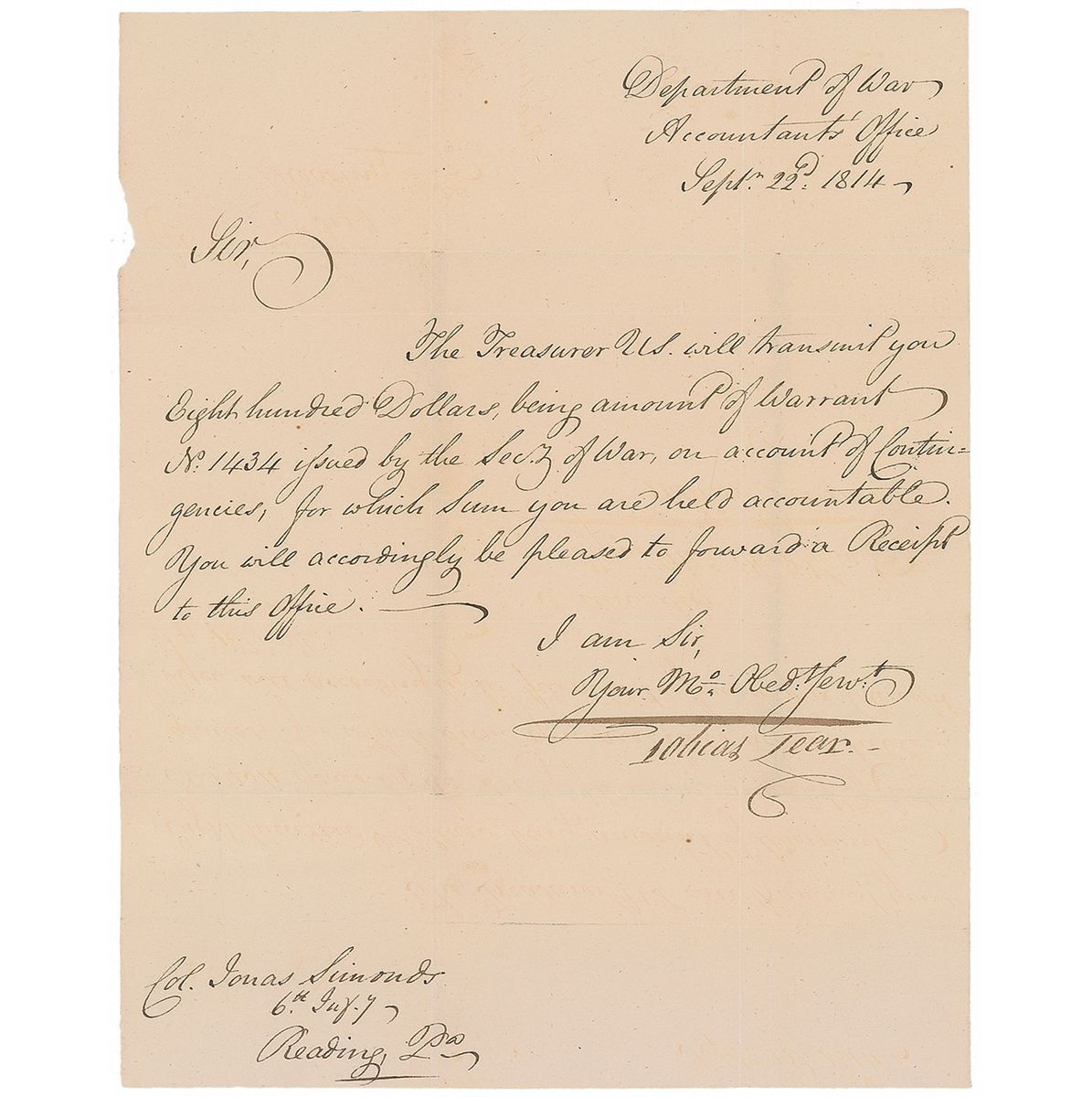 American statesman (1762–1816) who served as Washington’s personal secretary and later assumed posts in the Jefferson and Madison administrations. War-dated LS, one page, 7.75 x 9.75, September 22, 1814. Letter to Colonel Jonas Simonds. In part: “The Treasurer US will transmit you Eight hundred Dollars, being amount…issued by the Sec’y of War, on account of contingencies, for which Sum you are held accountable.” In fine condition, with intersecting folds (a few folds passing through signature) and a small area of paper loss to left edge.