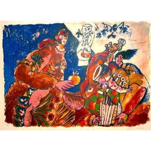 Tobiasse<p>Authentic and Original, Limited Edition Hand Signed stone lithograph. Titled " Symphonie pour une Pomme " c1997, Stone Lithograph on Arches. Signed and Numbered in Pencil by the artist. The Edition Size is 199. Full Size: 36" x 27". The condition is original, never framed. This is not an offset reproduction. <p>The art of Theo Tobiasse reflects a lifetime of struggle and a sense of survival that stems from his experiences as a Jew growing up in Paris during World War II. Tobiasse was born in Israel on April 26, 1927. To escape severe economic conditions his family settled in Paris, France in 1931. During the German occupation of France, Tobiasse and his family survived by going into hiding for two years living in total isolation and darkness. It is this sense of survival and the joy of that realization that typifies Tobiasse's work.<p>When the war ended in 1945, Tobiasse found work at various advertising agencies as a graphic designer. Moving to the South of France, he spent ten years in advertising before he decided in 1961 to concentrate solely on painting. His work reflects many themes including elements of his childhood memories, Jewish history, Biblical themes, and women. Since devoting his time to painting Tobiasse has been exhibiting his work extensively in Europe and the United States . His paintings have been described as having a purposely naive style with comparisons to Marc Chagall. Tobiasse divides his time between his studio at St. Paul de Vence near ...