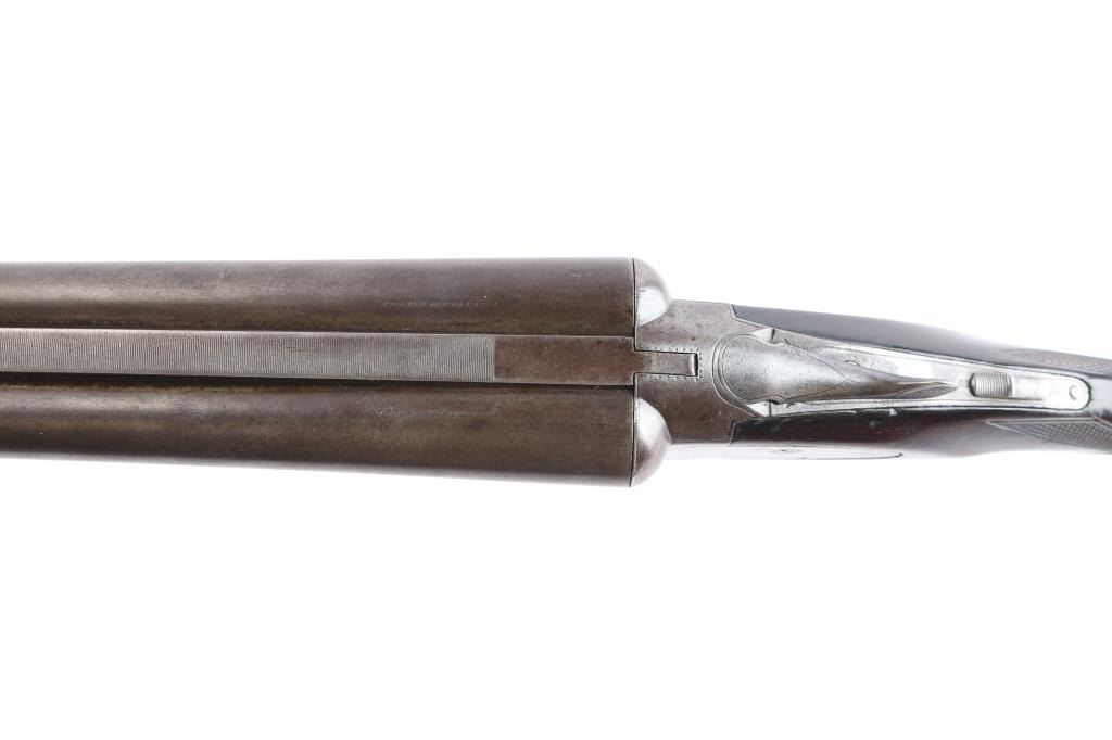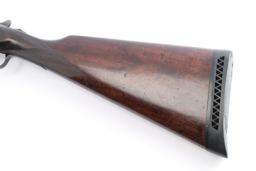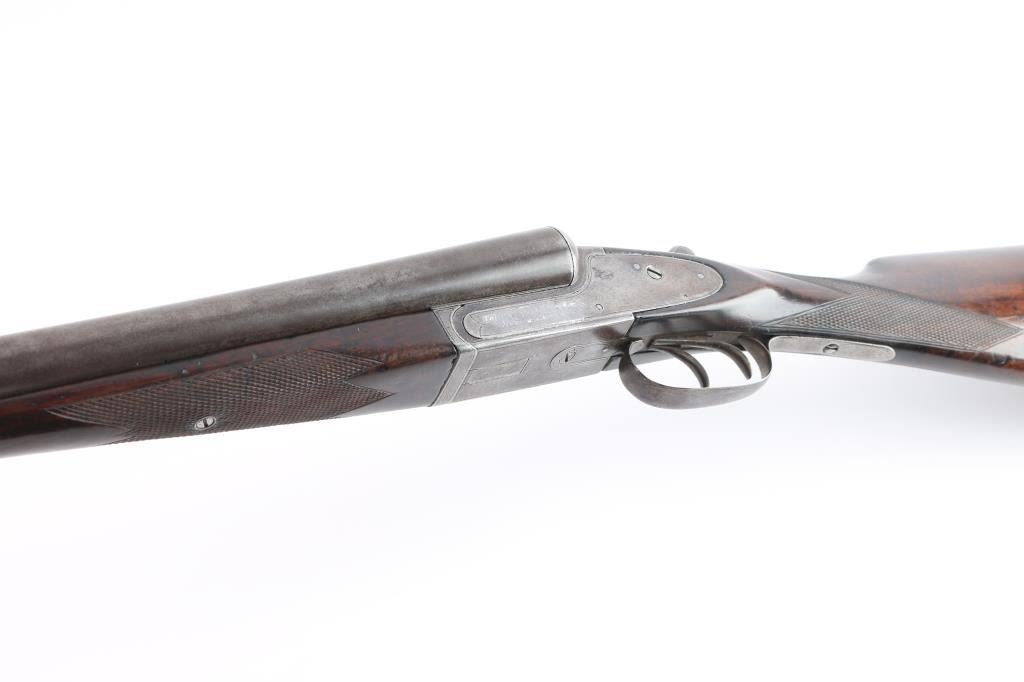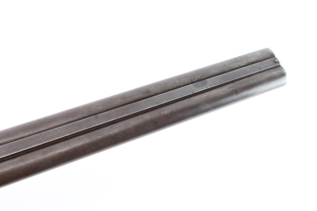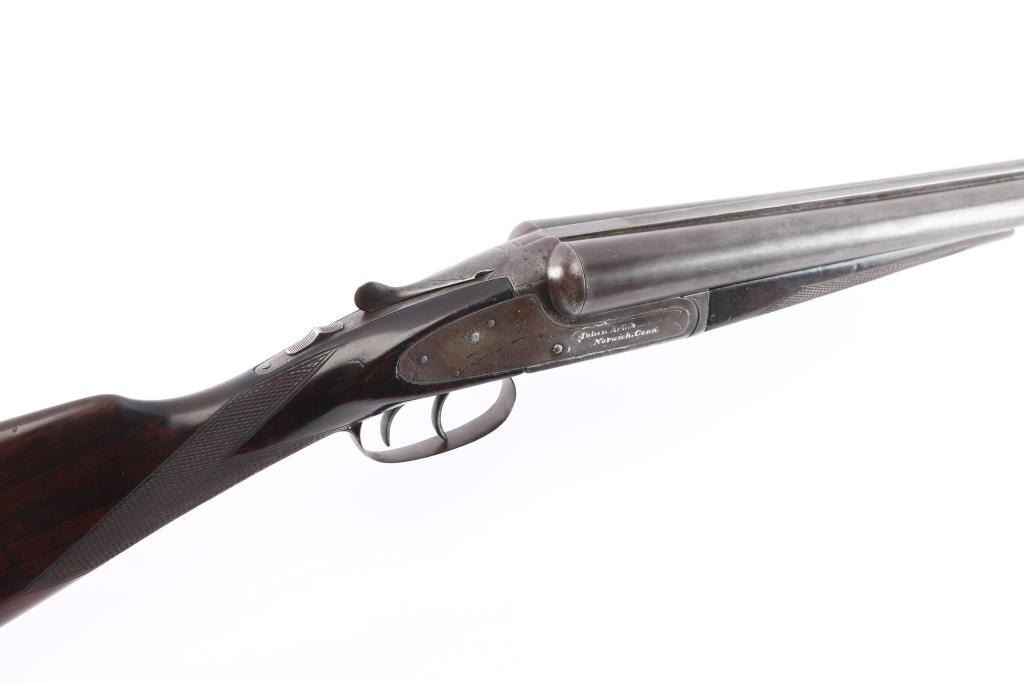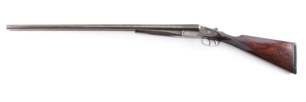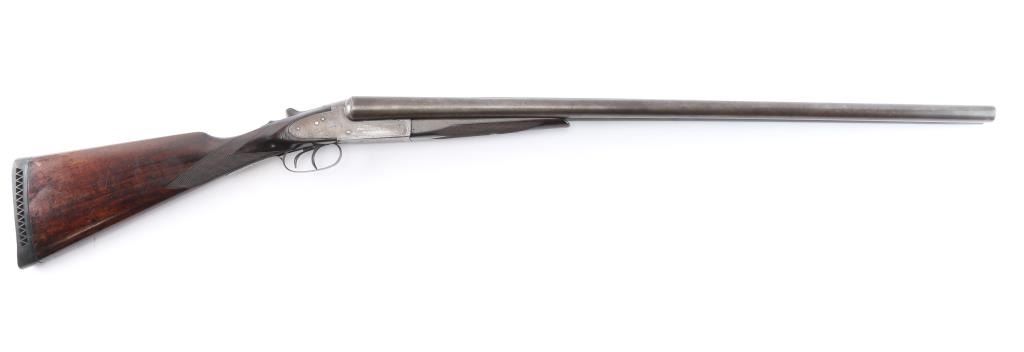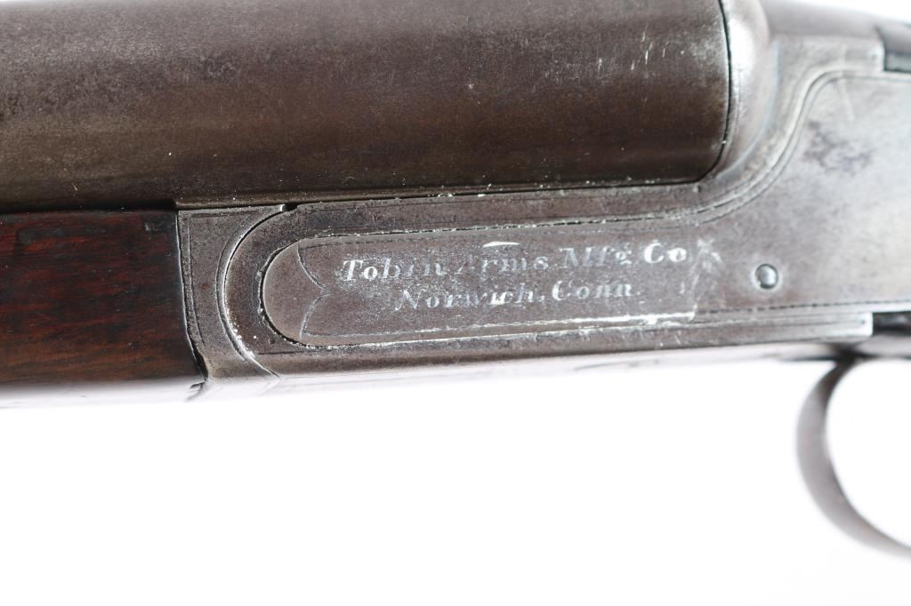 Vintage American made double barrel shotgun from an uncommon, even obscure, quality maker. "Norwich, Conn." address, made before this maker later moved to Canada. Features 30" side by side barrels with fixed "IM" chokes, marked "Trojan Nitro Steel", blued or browned finish on barrels, traces of case color on receiver. Internal hammer back lock action with sideplates, automatic safety, double triggers, extractor, bead front sight. Walnut stocks are checkered, with 13-3/8" LoP to rear trigger (12.75" to end of wood), 14.25" to front trigger. 1.-3/8" drop at comb, 2-3/8" at heel. Splinter forend. Ventilated rubber recoil pad. English stock with straight wrist. Barrels show bright bores, some small areas of pitting and patina on outside, slight smoothing of rib serrations. Light patina in various places. Serial number matches on trigger guard, barrels, frame, and under forend. Wood is good solid condition with scratches and dings, good even depth to checkering, gloss oil finish with slight erosion to points. Action is sound with snug lock-up. Screw heads show some marring of slots, markings are generally readable.