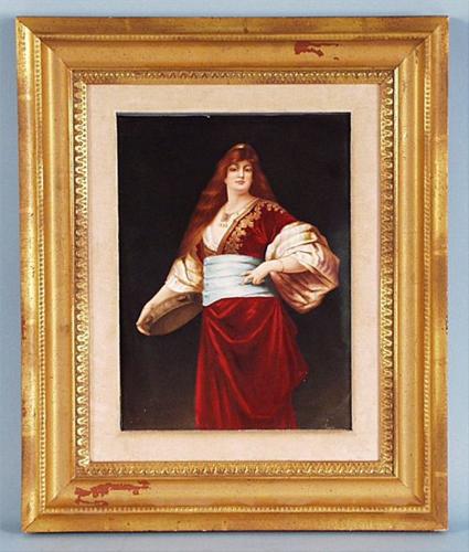 Tochter des Kalifen. A fine antique German K.P.M. porcelain plaque. Hand painted by Allmann with the figure of a well dressed young lady holding a drum. Signed lower right. Fully marked, titled and hallmarked on the reverse. 9 1/2" x 7 1/4". In gilt frame.