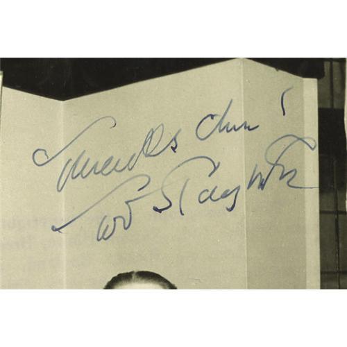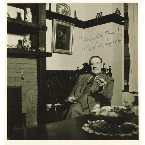 <B>Horror Icon Tod Slaughter Signed Photo.</B></I> Halloween comes early for vintage horror fans: Tod Slaughter was an actor who seemed hell-bent on living up to his last name -- notably as <I>Sweeney Todd: the Demon Barber of Fleet Street.</B></I> The gloriously over-the-top actor, hailed as "The Last of the British Barnstormers," played for decades onstage as the mad-for-revenge Todd (a barber who cut the throats of his victims, who later become meat pies), also starring in a 1936 British film version. His Victorian acting style of mad, cackling villainy won him a special niche in horror cinema, and this is a superb b&w 8" x 10" photo of the "Sweeney Todd" actor, inscribed and signed by him in black ink, and showing him in his study at peace with the world (and at odds with his professional image). Signed photos of this full-blooded horror star are rare indeed, and this one comes in Very Fine to Excellent condition with mild wear. <I>Accompanied by LOA from PSA/DNA.</B></I><BR><BR><b>Shipping:</b> Flat Material, Small (<a target="_blank" href="http://www.heritageauctions.com/common/shipping.php">view shipping information</a>) <BR><BR><B>Important notic