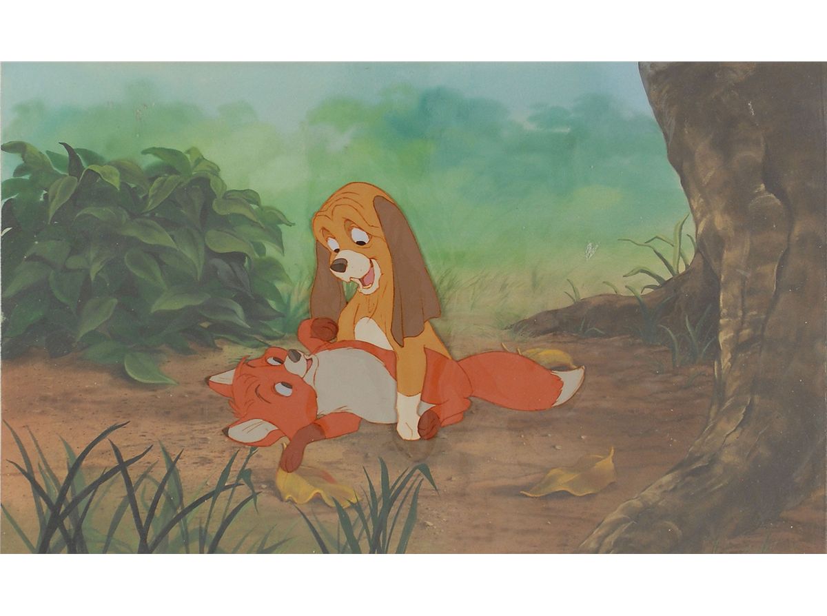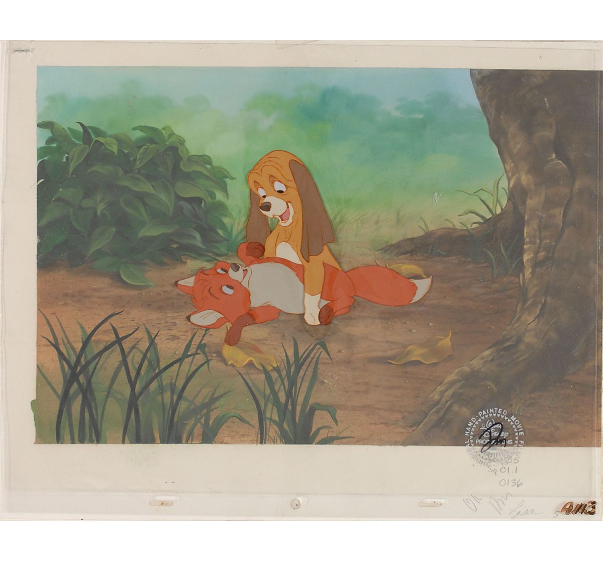 (Walt Disney Studios, 1981) Original production cels on production background featuring Tod and Copper from Fox and the Hound, showing them adorably frolicking in a forest clearing. The cel is placed on a hand-painted production background. Image measures 6.5 x 5.25, with overall dimensions of 15.75 x 12.5. The piece has a 1980 Walt Disney Productions certification seal to the lower right. In fine condition. A wonderful production pairing from Disney’s classic anthropomorphic bildungsroman.