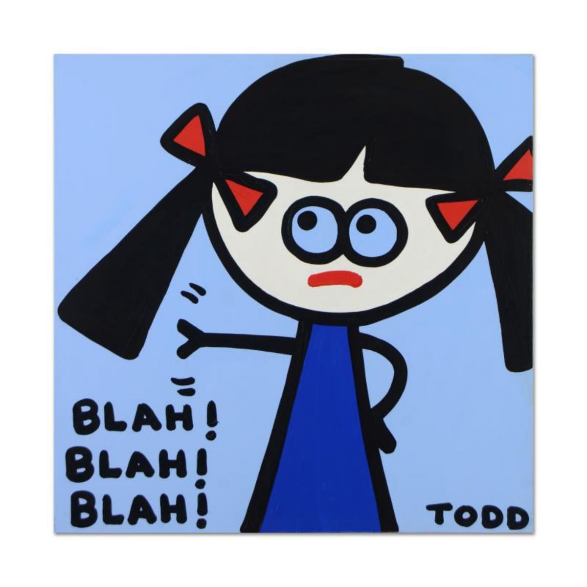 "Blah, Blah, Blah" is an original acrylic painting on canvas by Todd Goldman, hand signed by the artist. This piece comes gallery wrapped. Includes Certificate of Authenticity. Measures approx. 36" x 36" (image). Please note: There is wear on the corners and edges of this piece. Reference #: 234837