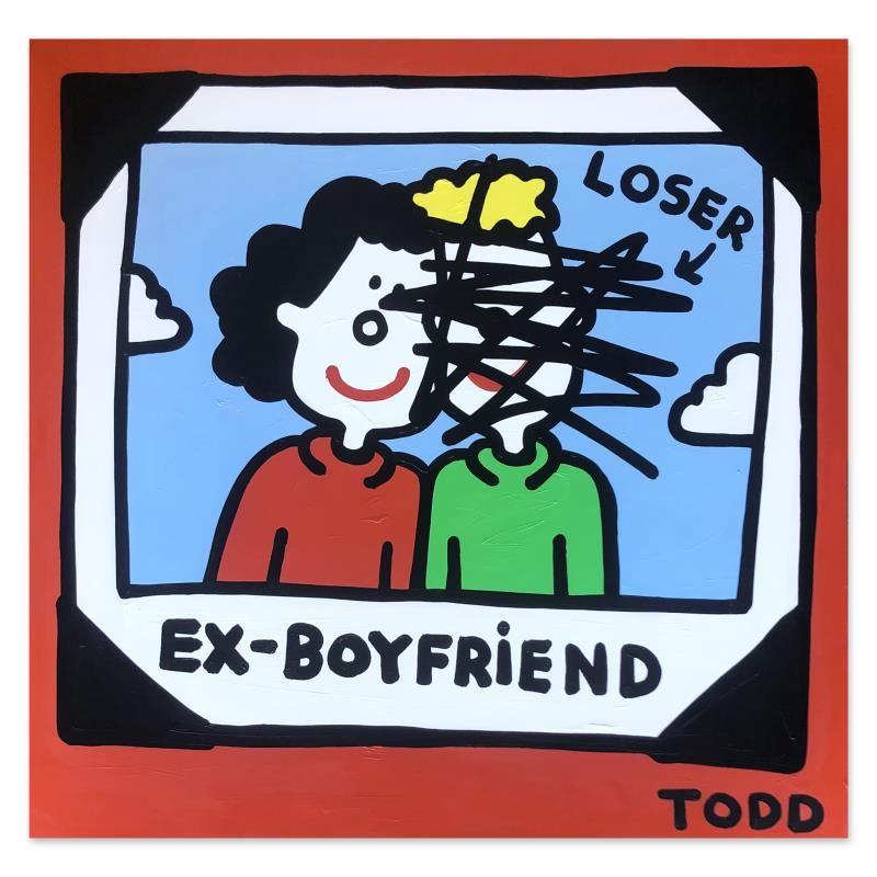 "Ex-Boyfriend" is an original acrylic painting on gallery wrapped canvas by Todd Goldman. The piece is hand signed by the artist and includes a letter of authenticity. Measures approximately 48" x 48" (image).