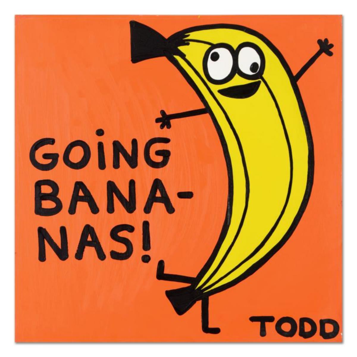 "Going Bananas!" is an original acrylic painting on canvas by Todd Goldman, hand signed by the artist. This piece comes gallery wrapped. Includes Certificate of Authenticity. Measures approx. 24" x 24" (image). There is minor wear on the corners and edges of this piece. Reference #: 234814