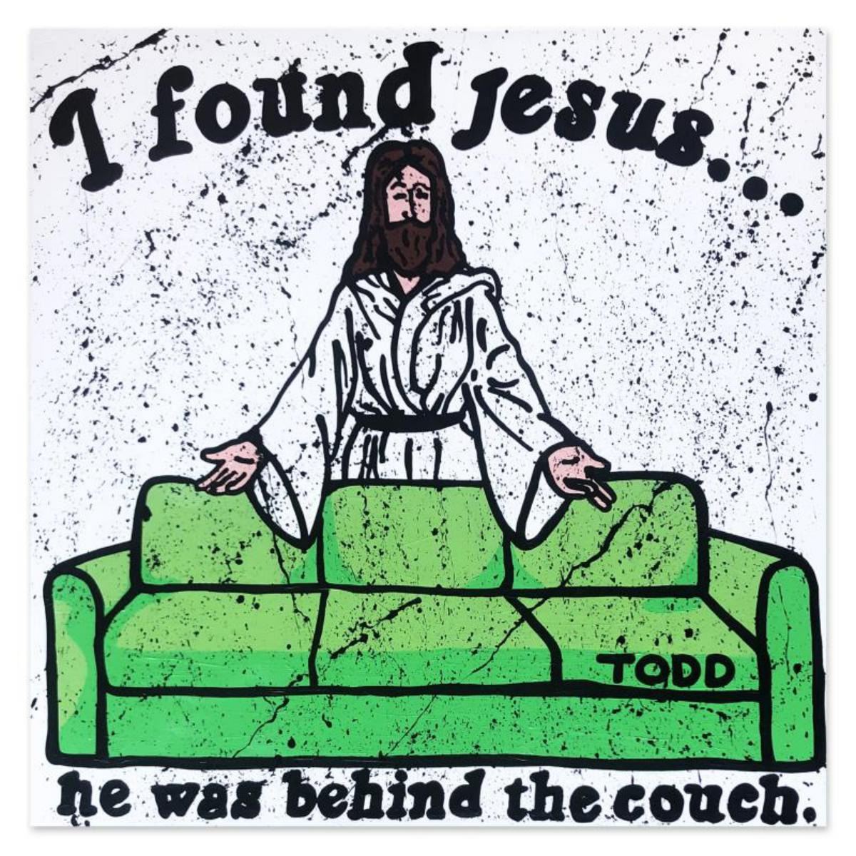 "I Found Jesus" is an original acrylic painting on gallery wrapped canvas by Todd Goldman. The piece is hand signed by the artist and includes a letter of authenticity. Measures approximately 48" x 48" (image). Reference #: 242692