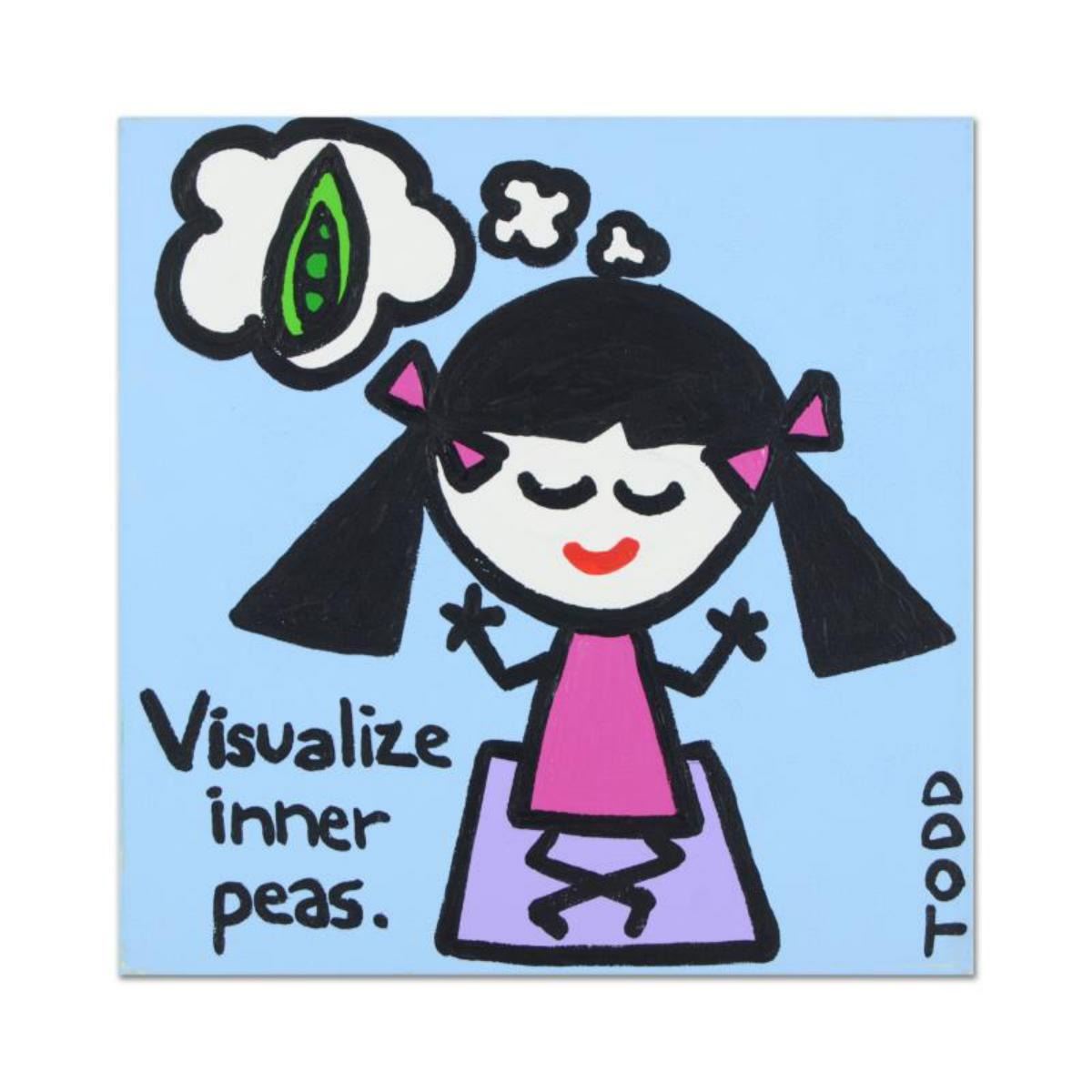 "Inner Peas" is an original acrylic painting on canvas by Todd Goldman, hand signed by the artist. This piece comes gallery wrapped. Includes Certificate of Authenticity. Measures approx. 24" x 24" (image). Please note: There is wear on the corners and edges of this piece. Reference #: 234848