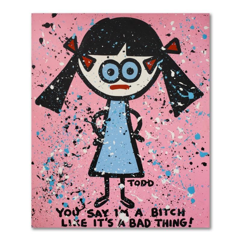 "Like It's a Bad Thing" is an original acrylic painting on canvas by Todd Goldman, hand signed by the artist. This piece comes gallery wrapped. Includes Letter of Authenticity. Measures approx. 60" x 72" (image). Please note: There is wear on the corners