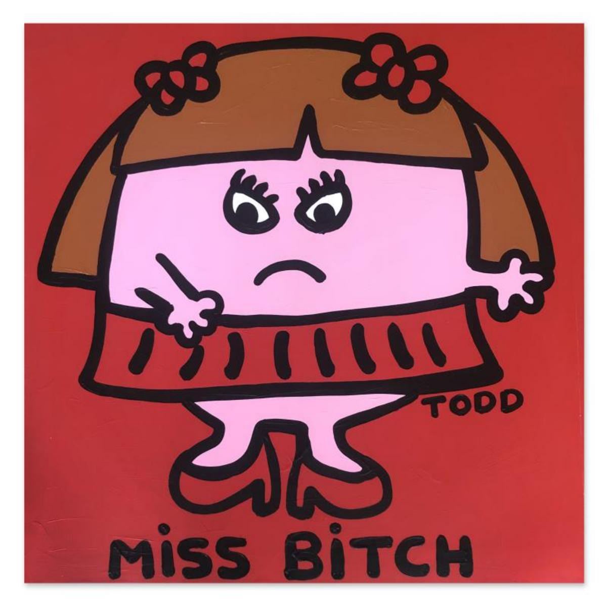 "Miss Bitch" is an original acrylic painting on gallery wrapped canvas by Todd Goldman. The piece is hand signed by the artist and includes a letter of authenticity. Measures approximately 36" x 36" (image). Reference #: 243916