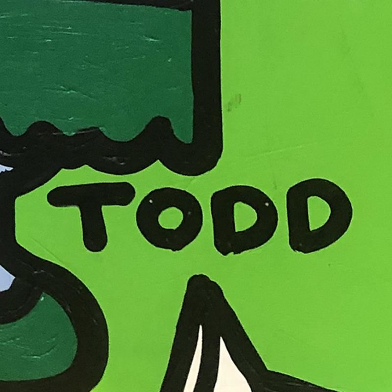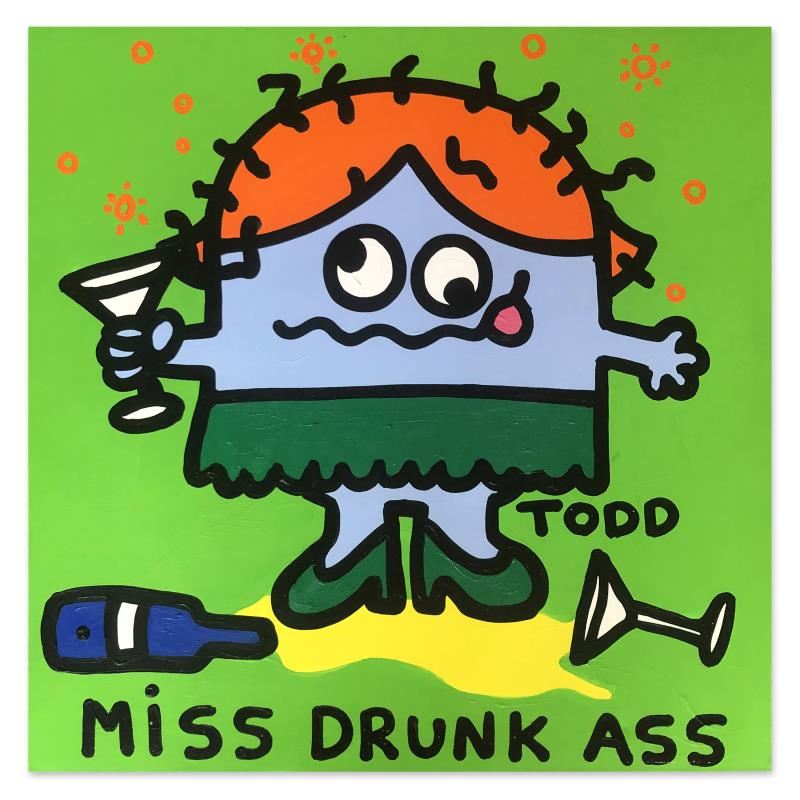 "Miss Drunk Ass" is an original acrylic painting on gallery wrapped canvas by Todd Goldman. The piece is hand signed by the artist and includes a letter of authenticity. Measures approximately 36" x 36" (image).