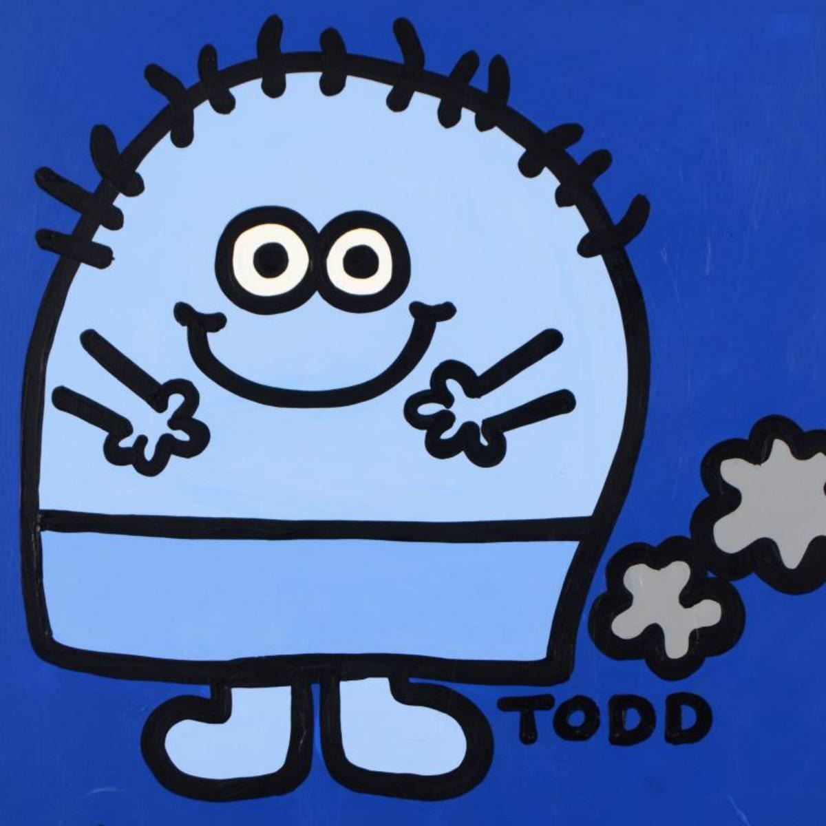 "Mr Fartface" is an original acrylic painting on canvas by Todd Goldman, hand signed by the artist. This piece comes gallery wrapped. Includes Certificate of Authenticity. Measures approx. 36" x 36" (image). There is minor wear on the corners and edges of this piece. Reference #: 233511