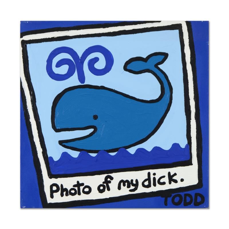 We acquired this piece as part of a larger collection. We do not approve of it's inappropriate content. "Photo of My !@#$" is an original acrylic painting on canvas by Todd Goldman, hand signed by the artist. This piece comes gallery wrapped. Includes Cer