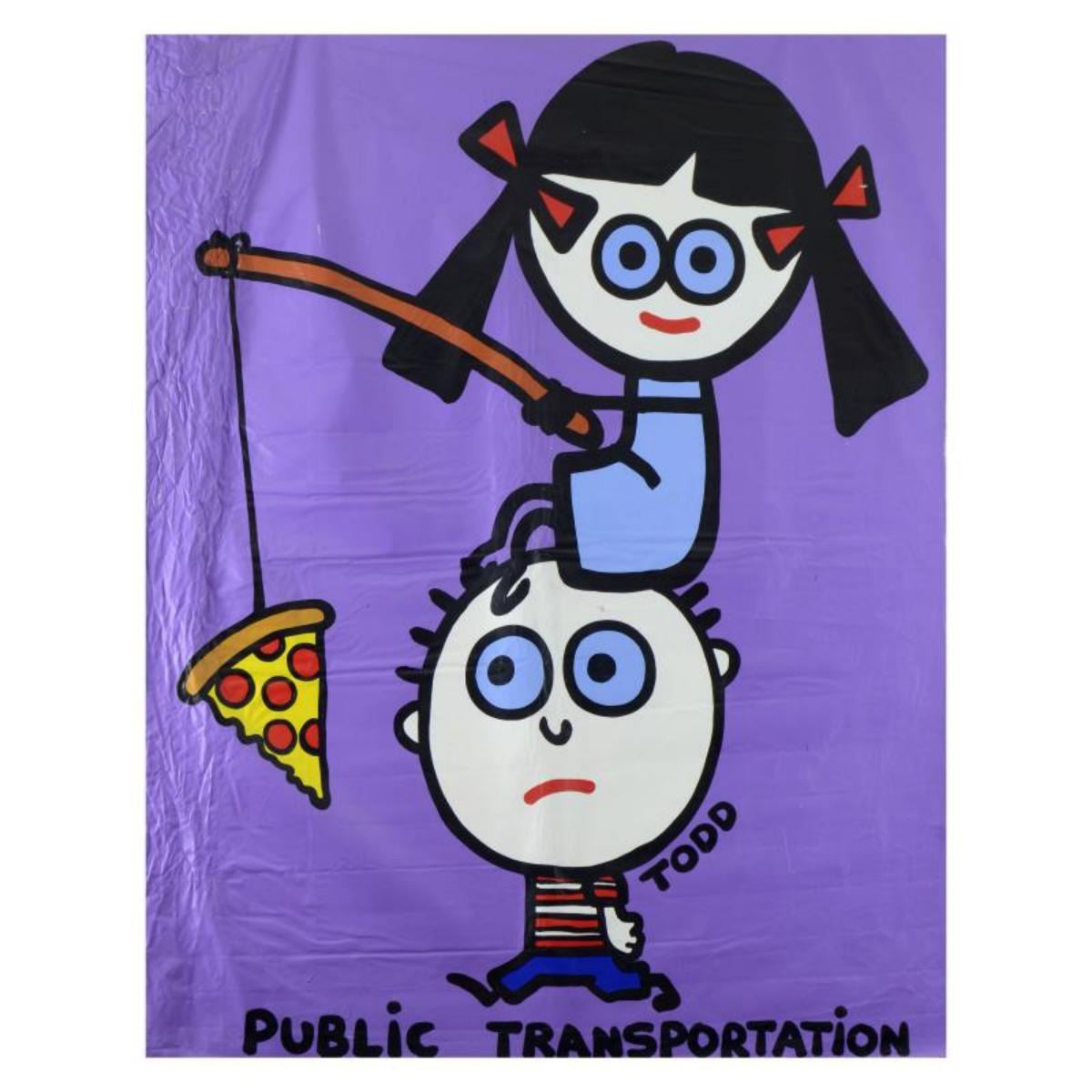 "Public Transportation" is an original acrylic painting on canvas by Todd Goldman, hand signed by the artist. Includes Certificate of Authenticity. Measures approx. 60" x 70" (image). ** Please note: There is noticeable creasing on the canvas and there are some some scuffs and paint chipping on the image. ** Reference #: 220680