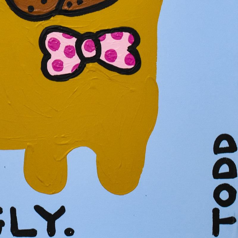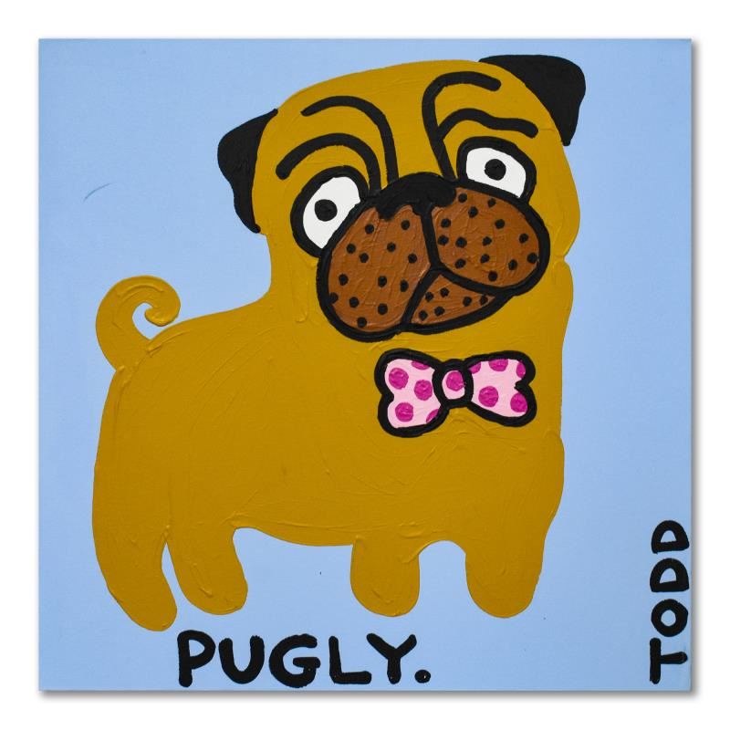 "Pugly" is an original acrylic painting on canvas by Todd Goldman, hand signed by the artist. This piece comes gallery wrapped. Includes Letter of Authenticity. Measures approx. 30" x 30" (image). Please note: There is wear on the corners and edges of thi