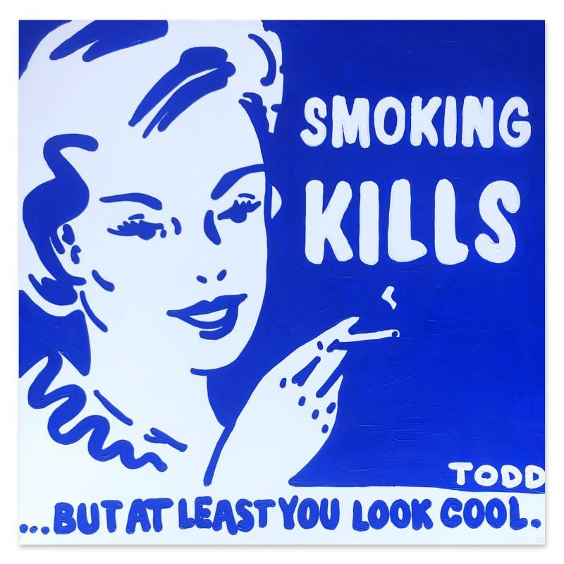 "Smoking Kills" is an original acrylic painting on gallery wrapped canvas by Todd Goldman. The piece is hand signed by the artist and includes a letter of authenticity. Measures approximately 48" x 48" (image).