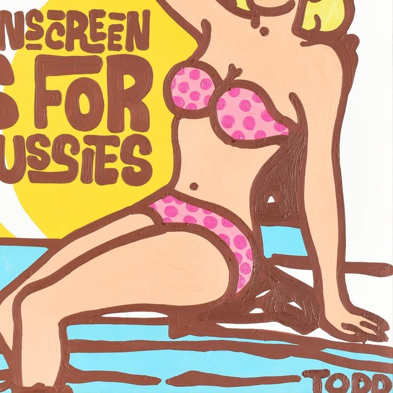 "Sunscreen Is For Wussies" is an original acrylic painting on gallery wrapped canvas by Todd Goldman, hand signed by the artist. Includes Letter of Authenticity. Measures approx. 48" x 60" (image). Due to the way this piece was stored there may be minor wear or signs of age (such as wear on the corners) but the piece is in overall good condition.