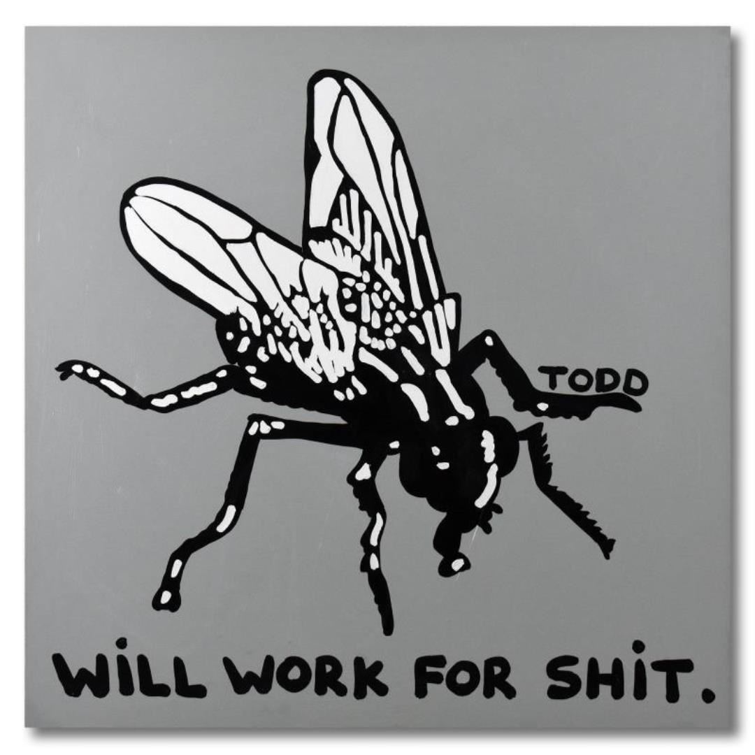 We acquired this piece as part of a larger collection. We do not approve of its inappropriate content. "Will Work For Shit" is an original acrylic painting on canvas by Todd Goldman, hand signed by the artist. This piece comes gallery wrapped. Includes Letter of Authenticity. Measures approx. 48" x 48" (image). ** Please note: There is minor wear on the corners and edges of this piece, as well as minor scuffs. **