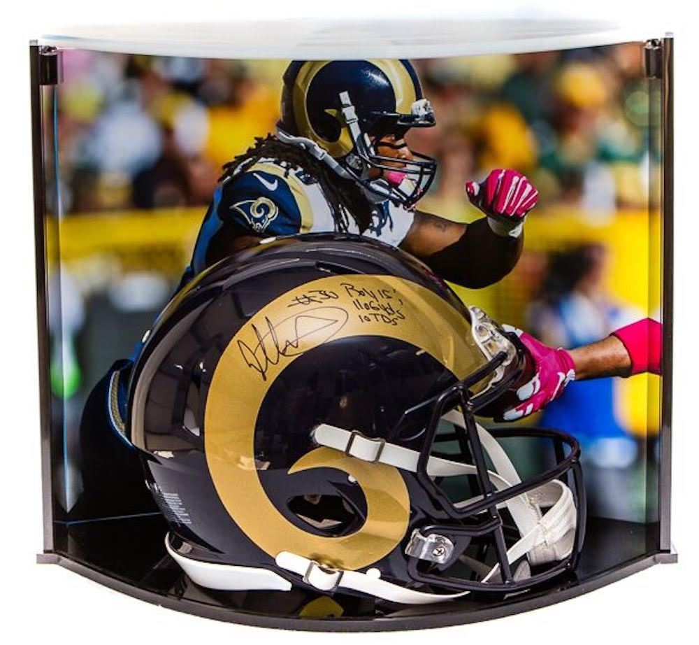 Overall, the display case has an approximate size of 19.875" wide x 16" high x 12.25" deep and weighs 9 lbs. Carefully packed inside a protective box for shipment are the display's base, two clear acrylic covers, lid, two side panels, brace, 4 screws, and a "game item" holder. This custom designed helmet and case is a must have for any sports fan. Please note, some minor assembly is required.