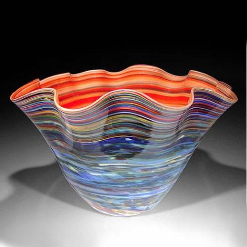 Todd Hansen 2005 blown glass ruffled edge bowl in earth tones: cool blues and other tones on the outside, warm oranges and reds on the inside. Signed and Dated. Height 8 1/4"; Diameter 13". Donated by: Todd Hansen.<p>Proceeds from the auction will go to benefit Santa Cruz, California glass artist Steven Lundberg, who, after 30 years of blowing glass locally, was diagnosed with amyotrophic lateral sclerosis, or ALS (Lou Gehrig's disease). This auction is a fundraising effort to help Steve meet the challenges of this disease.<p>Costs of treating ALS over a period of time can be exorbitant. In the short-term, Steve needs basic equipment such as an electric scooter and pointing devices to help him read and write.<p>Please join us for this auction, and help support a friend. Check out our other auctions to see the 150 paperweights, vessels, and glass sculptures from internationally known glass artists, donated by generous artists, galleries, and glass collectors from all over the country. Please contact us at 1-800-538-0766 or (831) 427-1177 for more information, or see <a href=http://www.selman.com/press target=_blank>www.selman.com/press</a>.