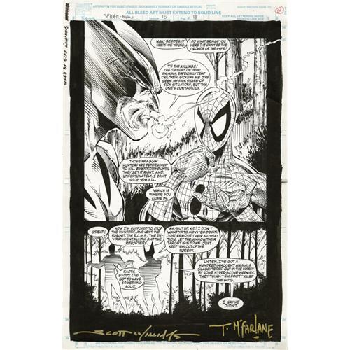 <B>Todd McFarlane and Scott Williams - Spider-Man #10 page 18 Original Art (Marvel, 1991).</B></I> Two mighty icons of the Marvel universe -- Spidey and Wolverine -- share a quiet moment in this stunningly-rendered page by fan-favorite Todd McFarlane, with an able assist from inker Scott Williams. Who could ask for anything more? The image area for this page measures 10.5" x 15.75" and the page has been signed by both McFarlane and Williams. There is a 3.5" tear on the right side of the top panel, which was repaired with tape at the time of publication; otherwise the art is in Very Good condition.