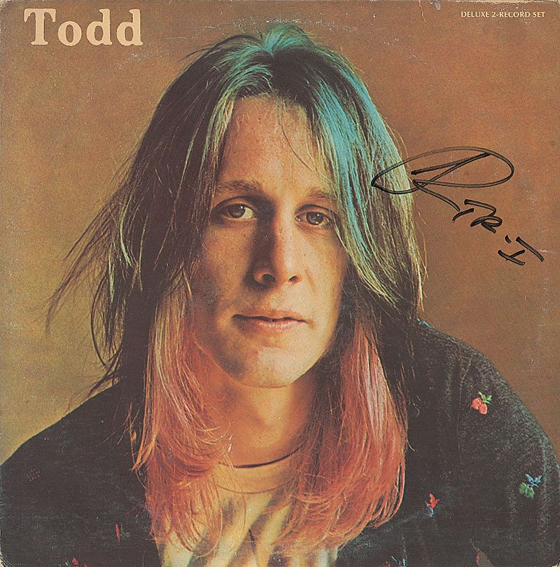 Todd album signed on the front cover in black felt tip. Mild ‘ring of wear’ to covers, scattered edge wear and creases, and old label affixed to reverse, otherwise fine condition. The record is included.