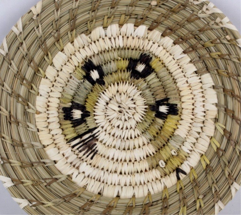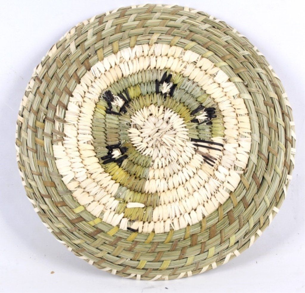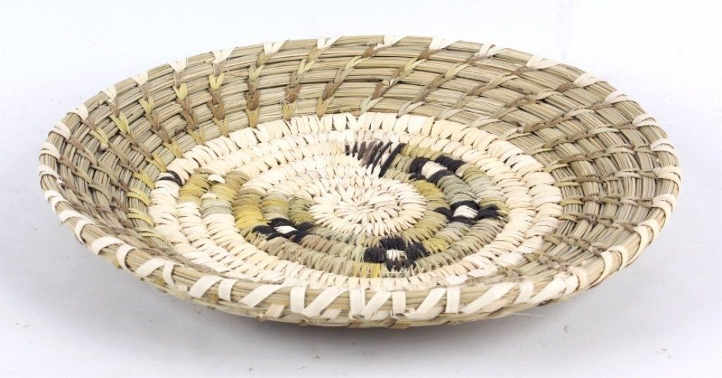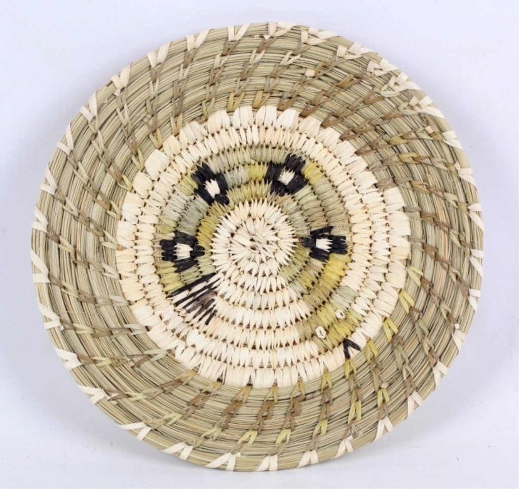 This is an original hand crafted weaving from the Tohona O'odham Native American Nation from Kit Peak, Arizona. The piece is crafted with bear grass, cattail, yucca willow shoots, devils claw. This piece was made byDell Cruz from Bobcat. Measures 11.25" in diameter.