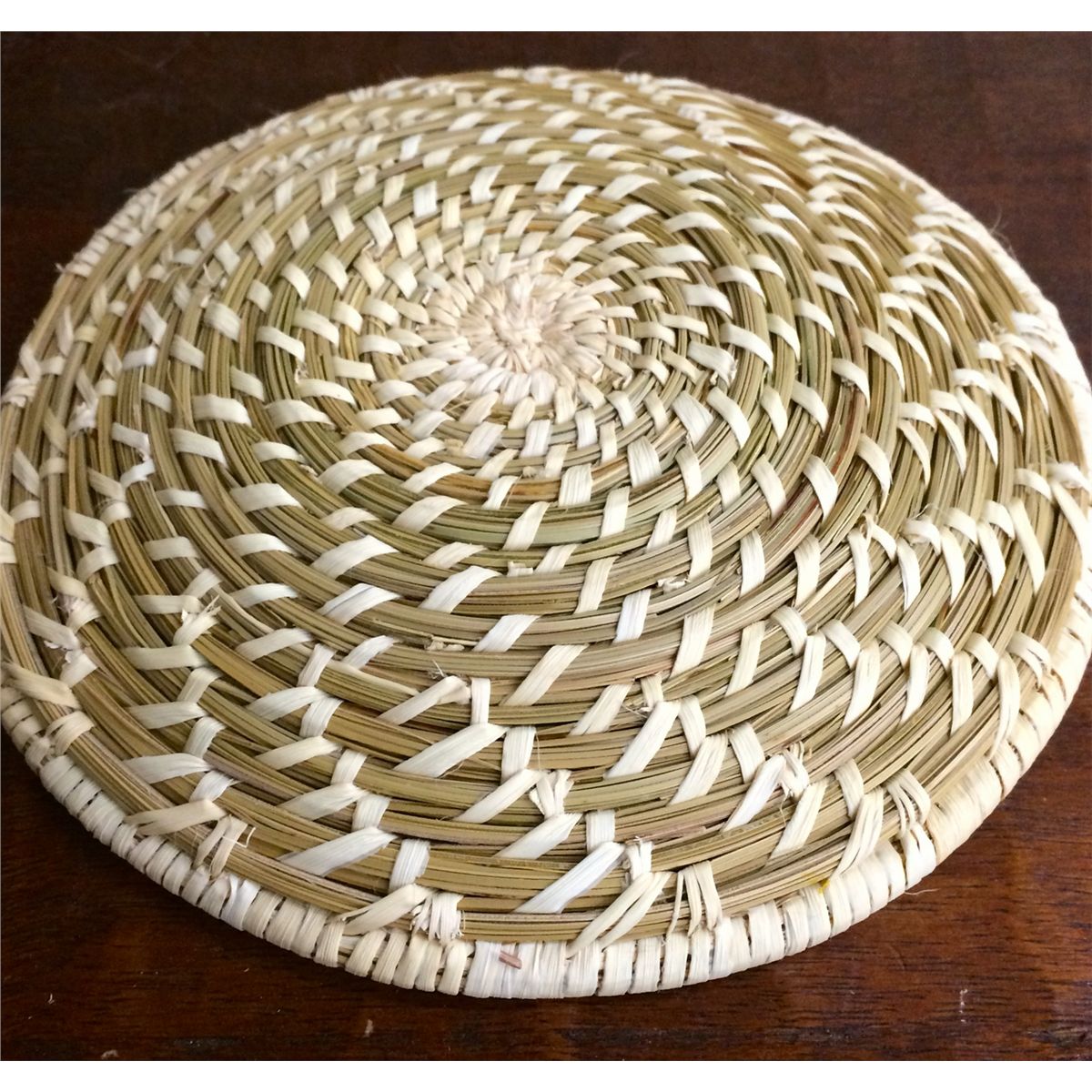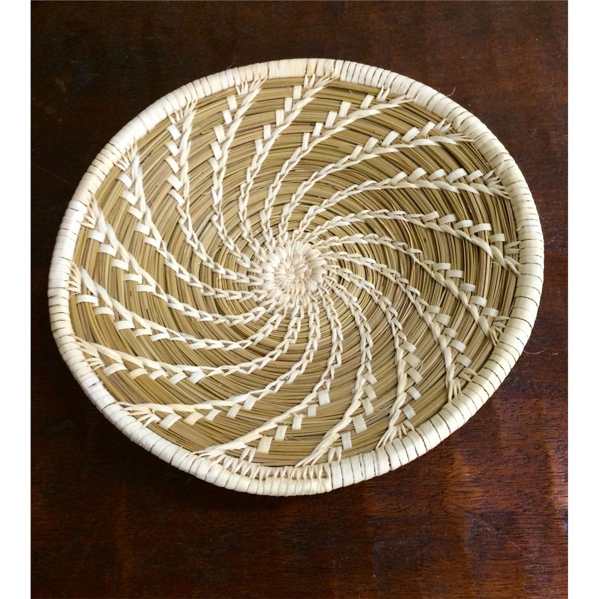 Also known as a Papago basket, this basket is made from bear grass and yucca. It measures approximately 7” wide.