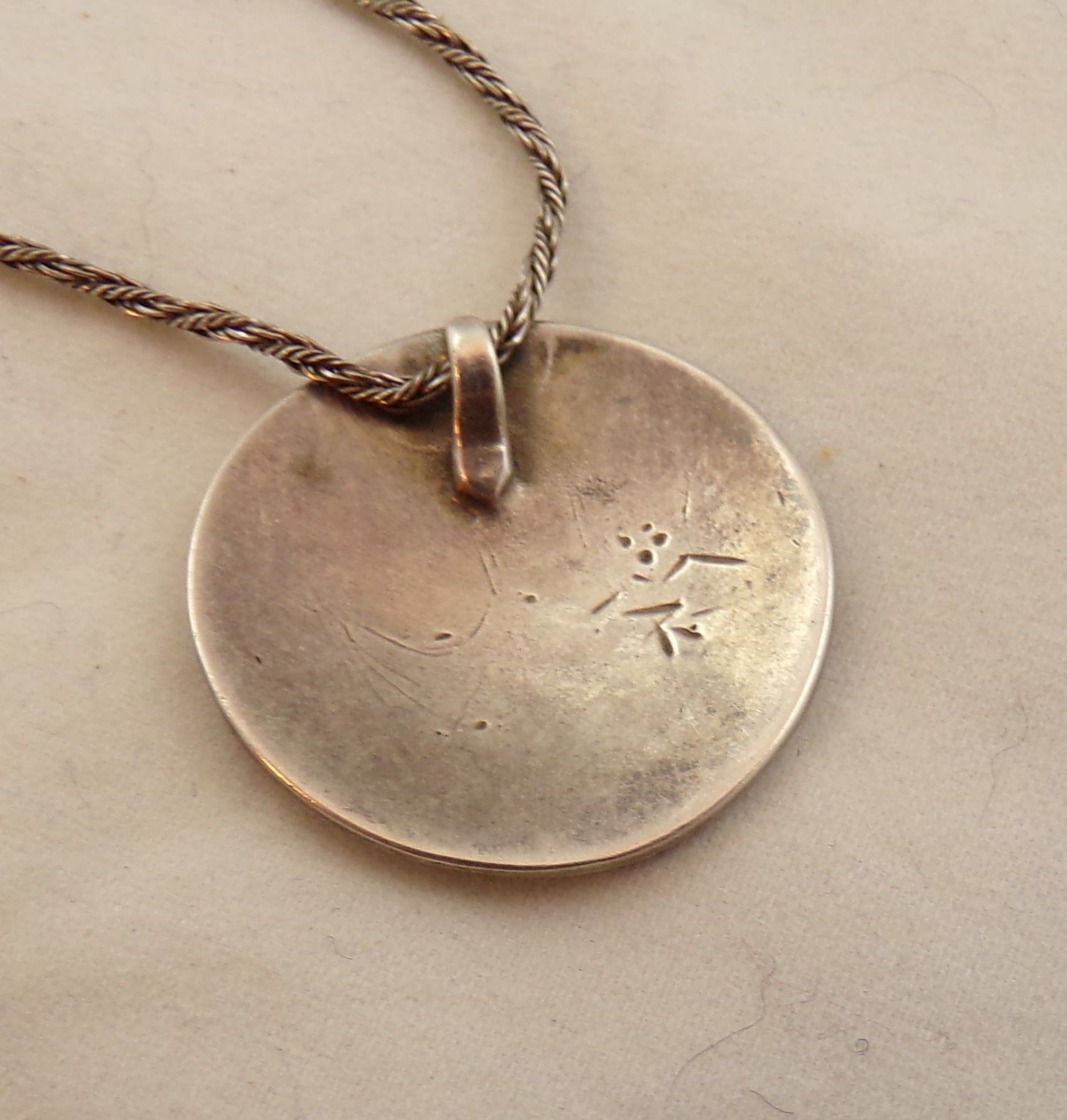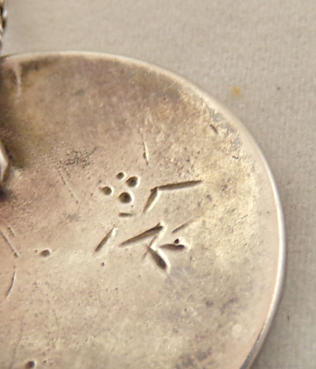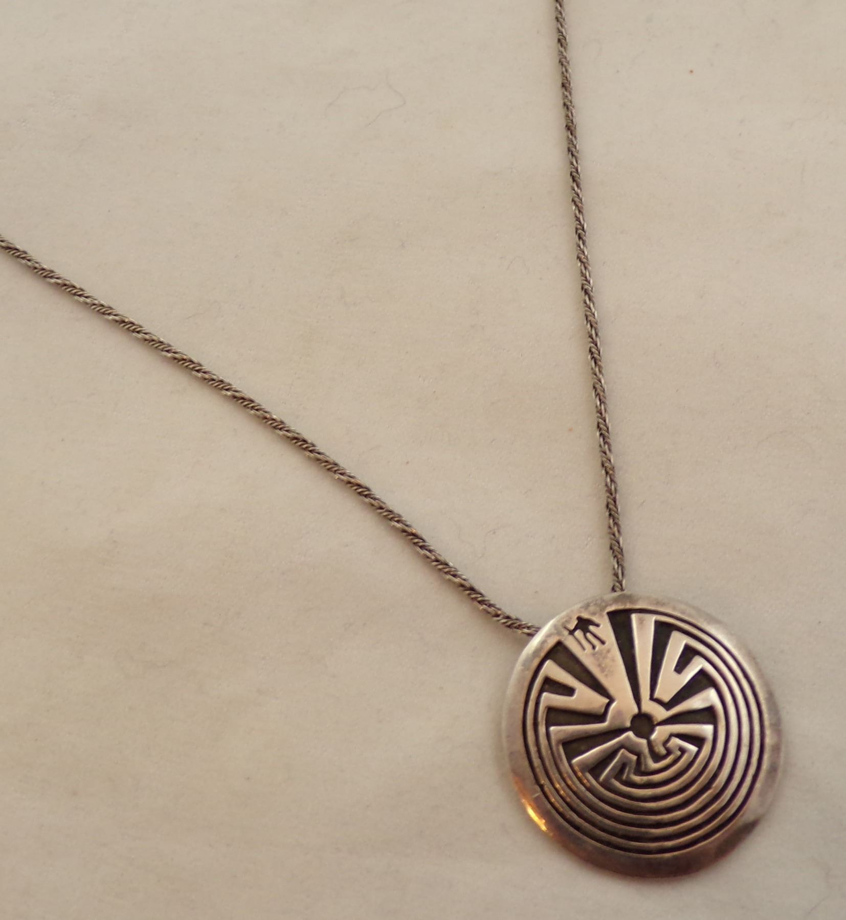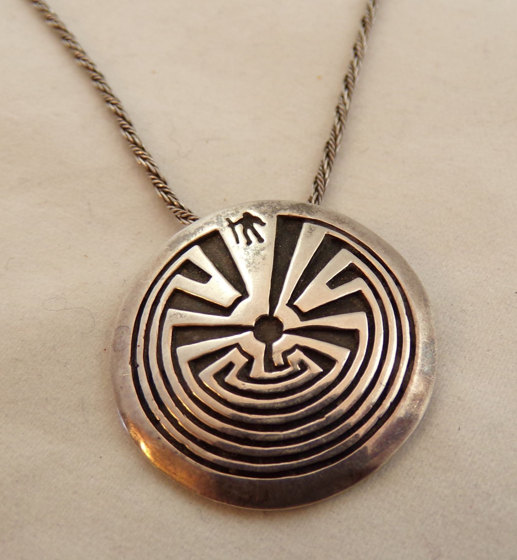 Native American Tohono O'odham Man in the Maze Pendant Necklace by Rick Manuel, pendant measures 1.25''D, Italian sterling rope chain measures 31''L end to end, hallmarked