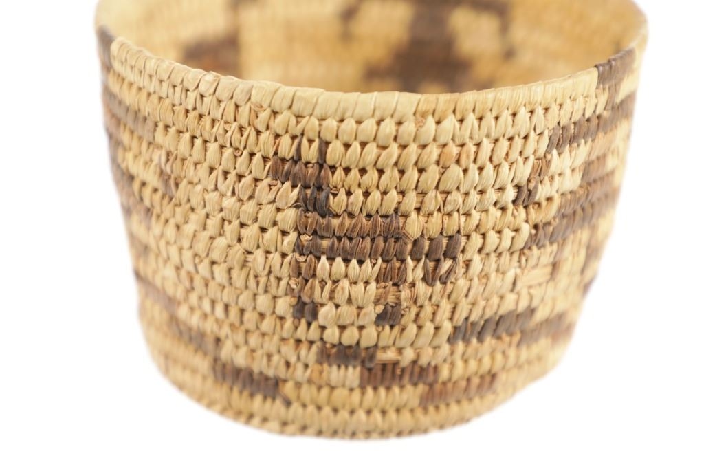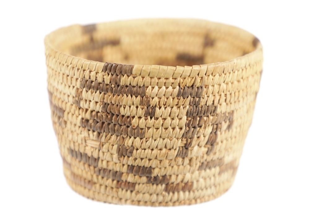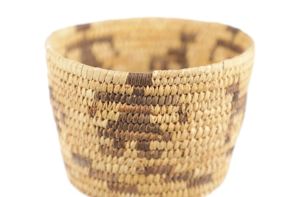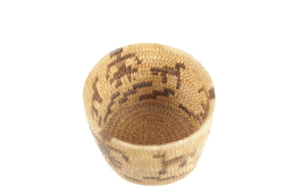 Featured in this lot is a Mid-Century Tohono O'odham Hand Woven Polychrome Pictorial Basket. This cylinder shaped basket features human and animal figures situated above Kiva steps, symbols that look like stairs. The steps usually represent three levels: birth, life, and death (after-life). The Pima Indians, Akimel O'odham, located in central and southern Arizona, are known for their fine and intricate watertight basket-weaving. At the turn of the century, the baskets served as a vital instrument used for religious ceremonies, as well as carrying, preparing, and serving food, washing, collecting, storing, trading, payment, and gifting. Pima Indian basket materials are Devil's Claw (Martynia), willow, yucca and Bear grass. Tohono O'odham basket makers are among the finest in Native America. All materials are natural, as are all the colors - no dyes are ever used. Preparing the materials and forming the baskets is a very labor-intensive process. This basket is in very good condition, weaving is tight, a rich patina is noted throughout, no obvious marring observed. Measures 5" diameter, 3.5"H.*
