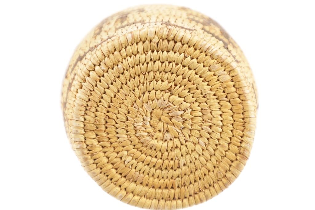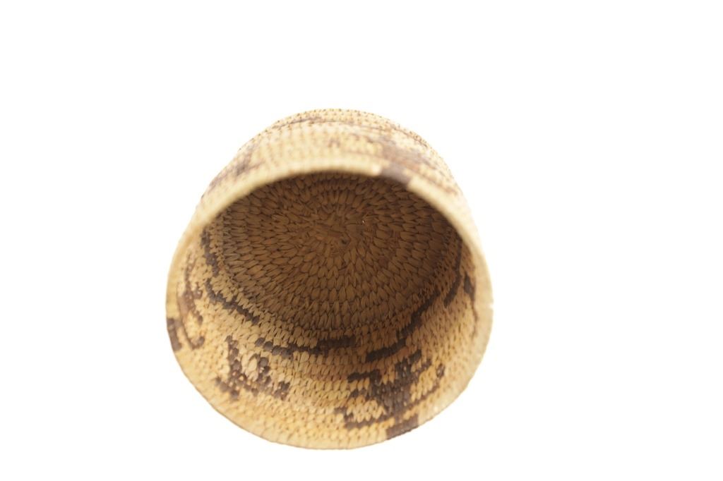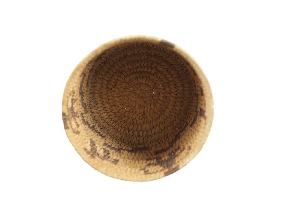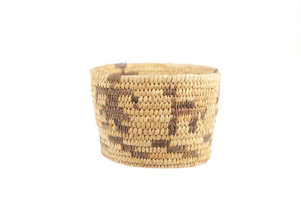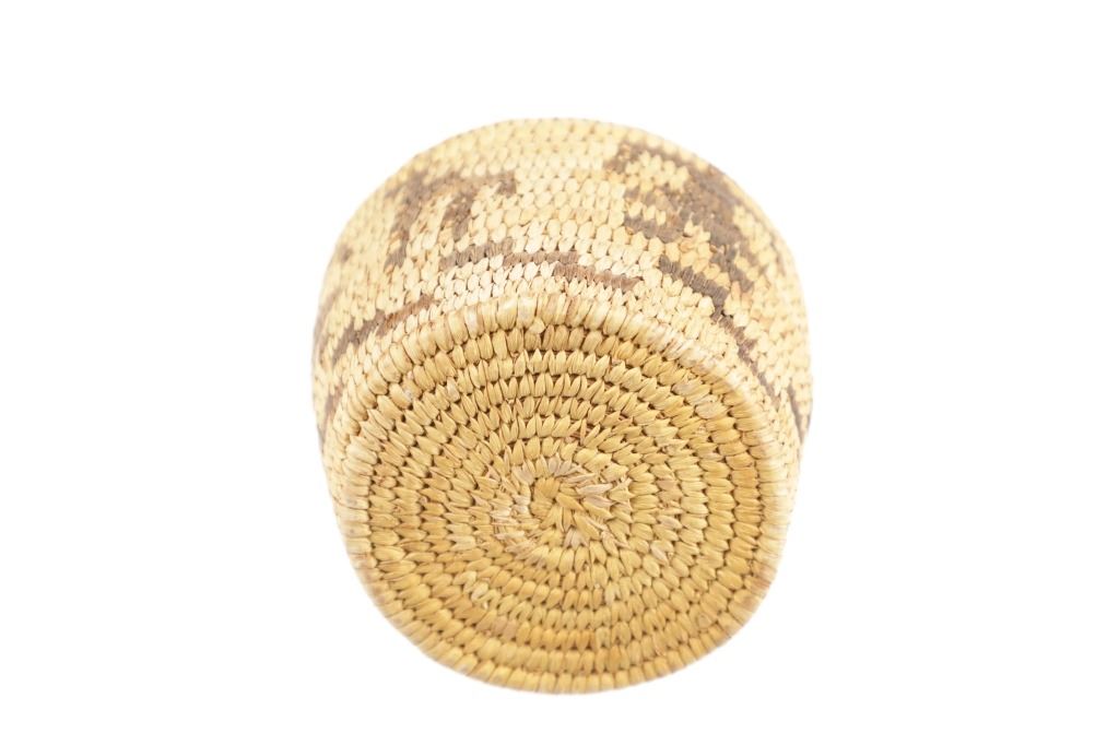 Featured in this lot is a Mid-Century Tohono O'odham Hand Woven Polychrome Pictorial Basket. This cylinder shaped basket features human and animal figures situated above Kiva steps, symbols that look like stairs. The steps usually represent three levels: birth, life, and death (after-life). The Pima Indians, Akimel O'odham, located in central and southern Arizona, are known for their fine and intricate watertight basket-weaving. At the turn of the century, the baskets served as a vital instrument used for religious ceremonies, as well as carrying, preparing, and serving food, washing, collecting, storing, trading, payment, and gifting. Pima Indian basket materials are Devil's Claw (Martynia), willow, yucca and Bear grass. Tohono O'odham basket makers are among the finest in Native America. All materials are natural, as are all the colors - no dyes are ever used. Preparing the materials and forming the baskets is a very labor-intensive process. This basket is in very good condition, weaving is tight, a rich patina is noted throughout, no obvious marring observed. Measures 5" diameter, 3.5"H.*