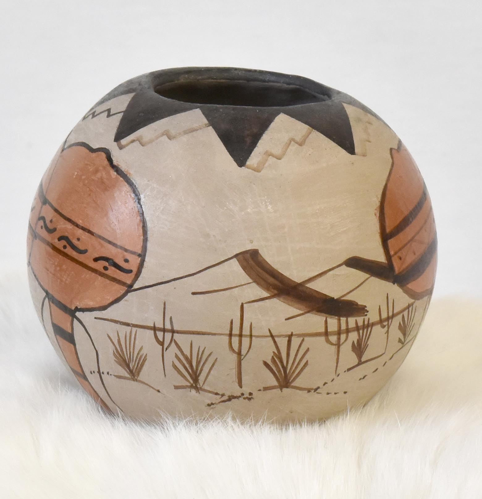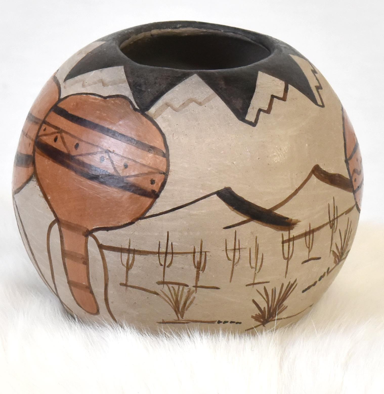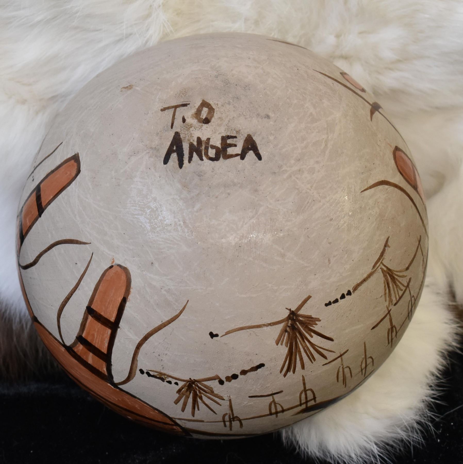 Native American Tohono O'odham Polychrome Pottery Seed Jar by the Angea Family, measures 3.5'' x 4'' and is marked on the bottom