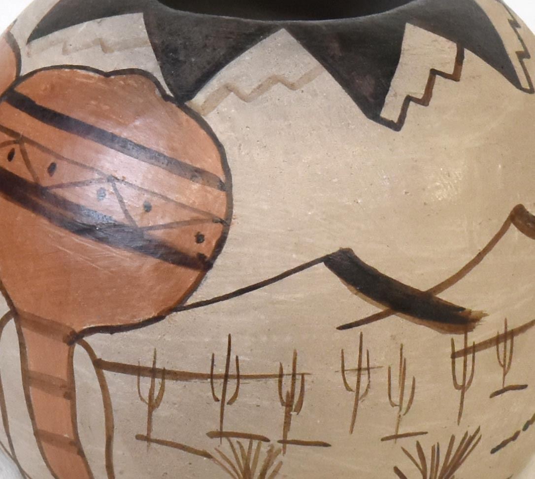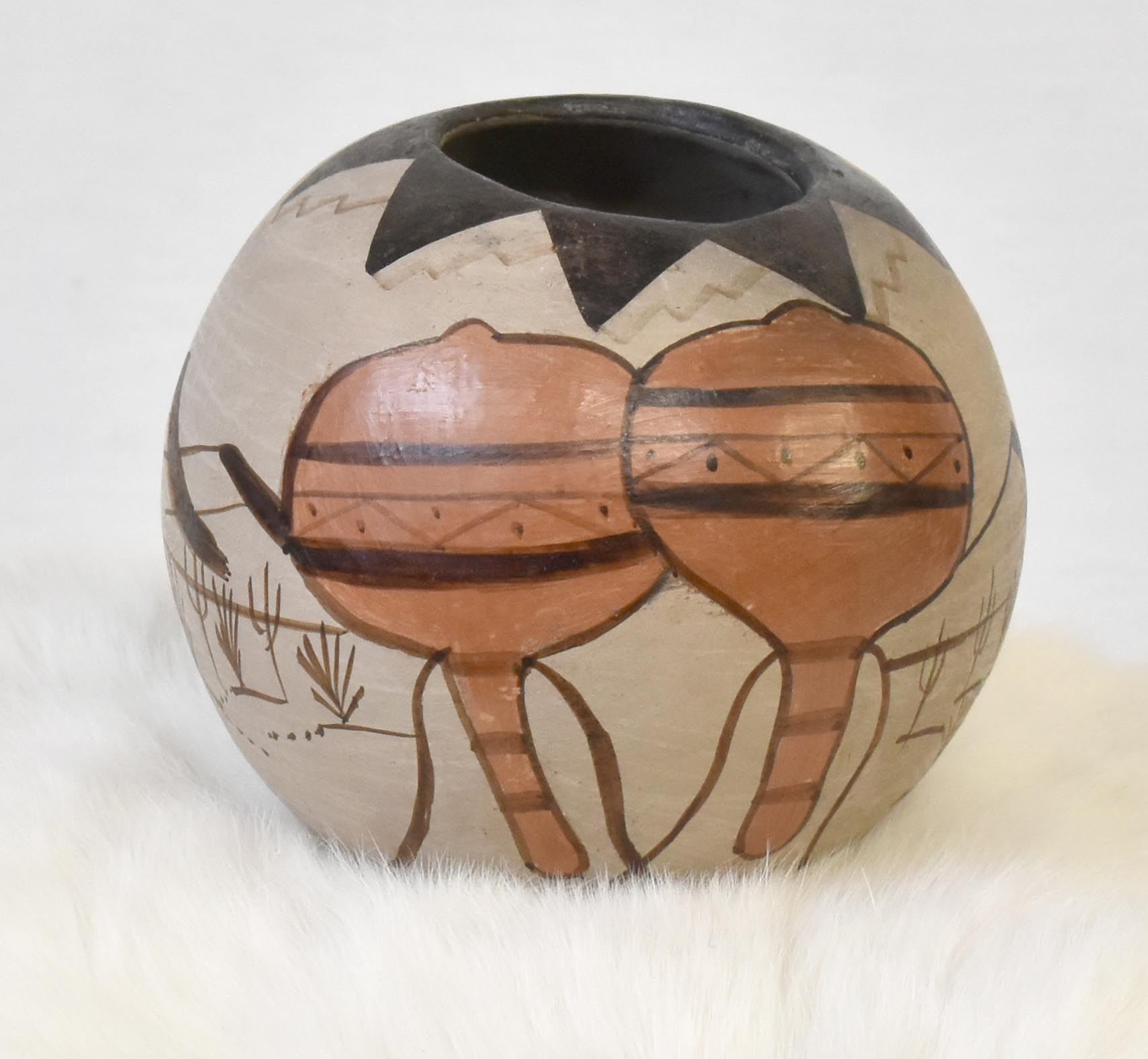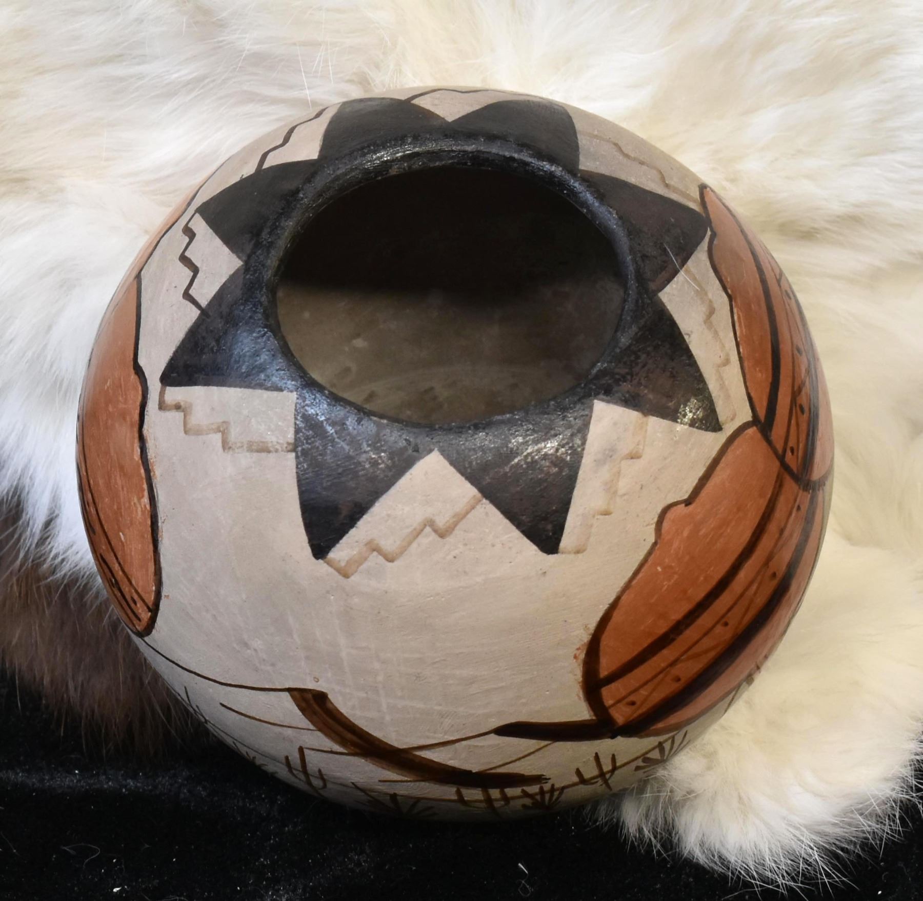 Native American Tohono O'odham Polychrome Pottery Seed Jar by the Angea Family, measures 3.5'' x 4'' and is marked on the bottom