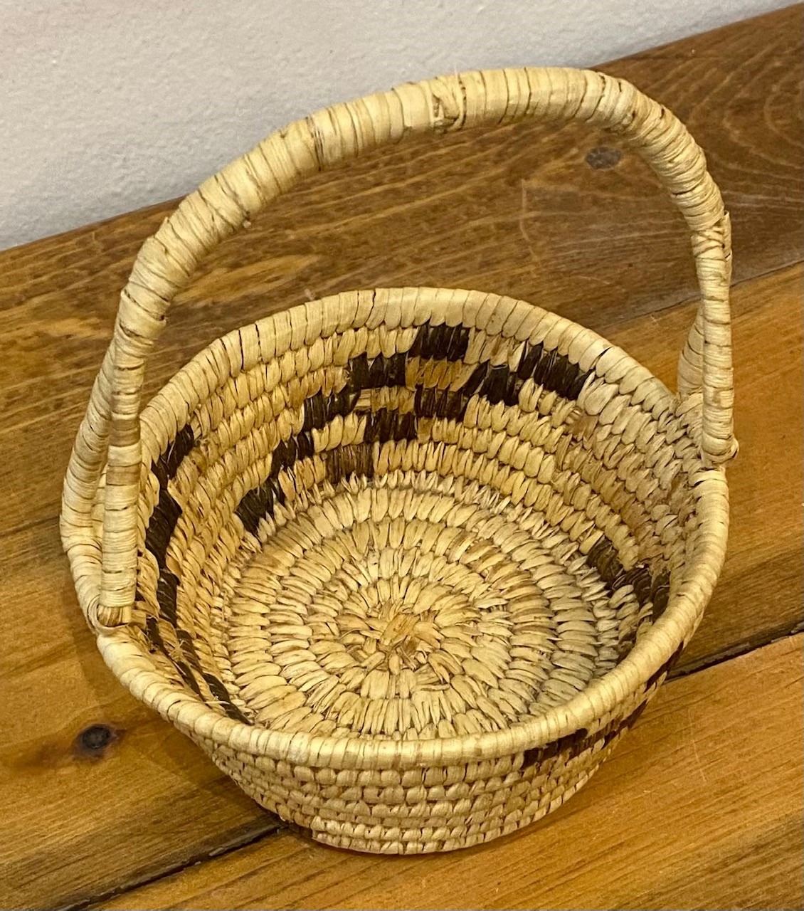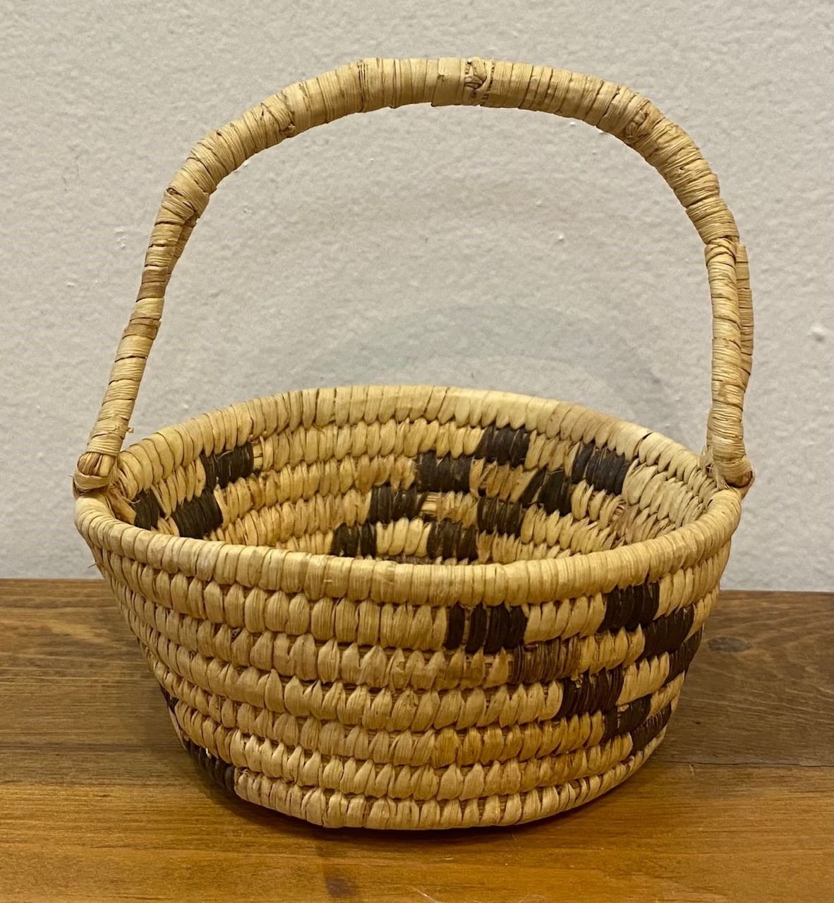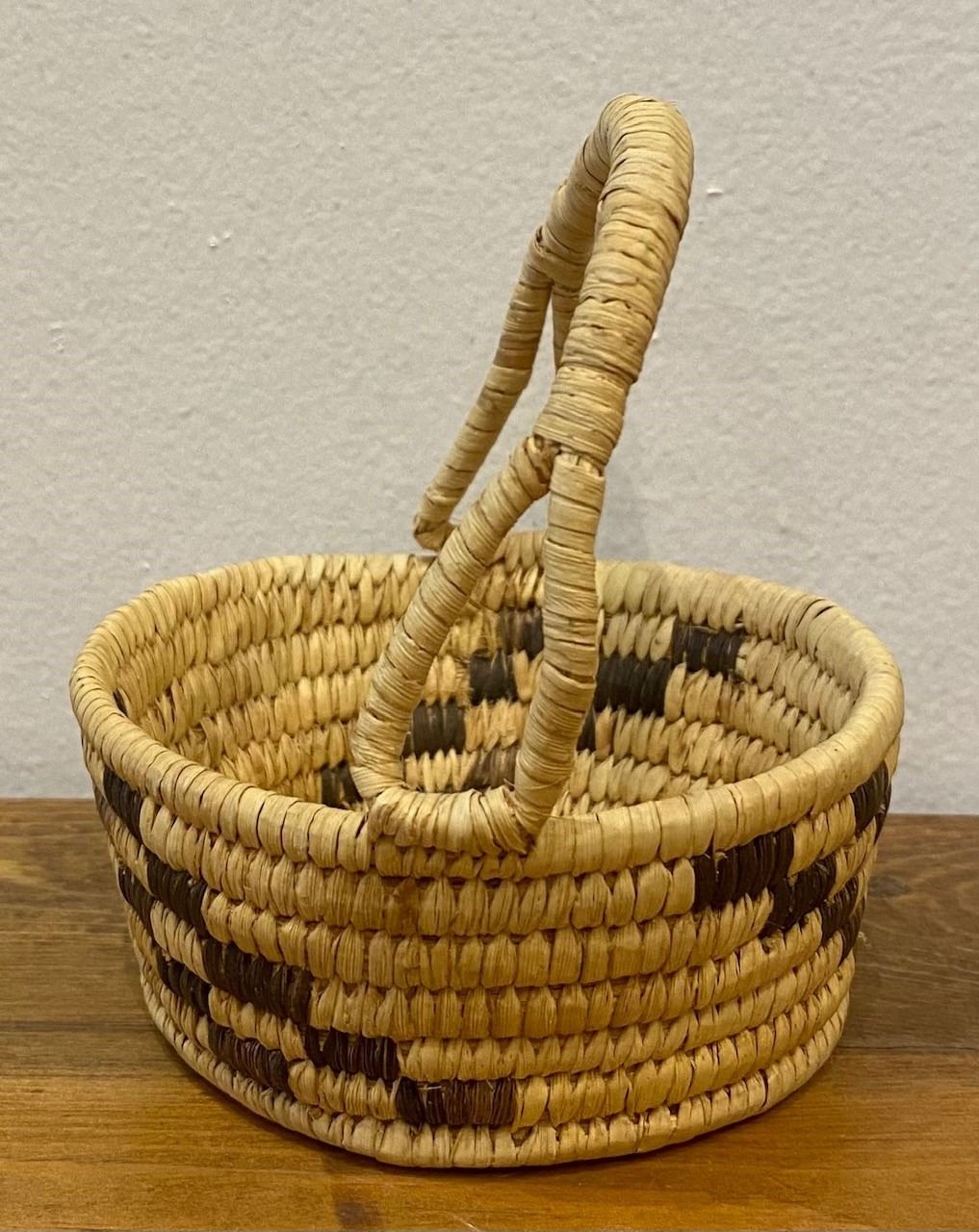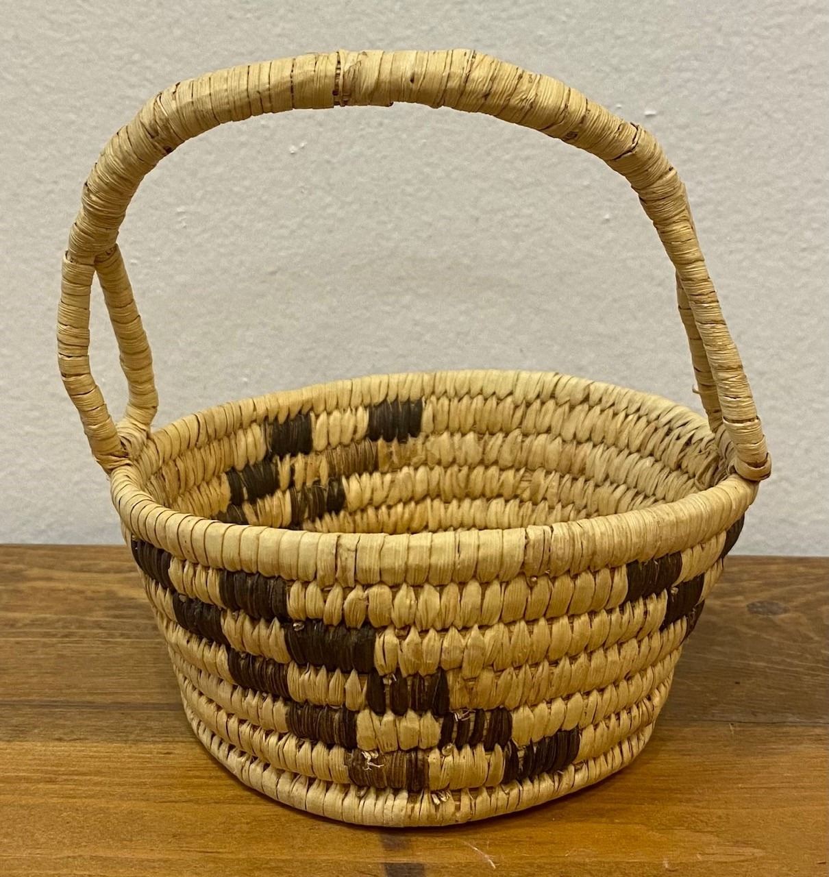 Very cute 4.75-inch tall by 4.25-inch-wide Tohono O'odham Handled Basket. Good Condition. Woven with Yucca and Devils Claw.