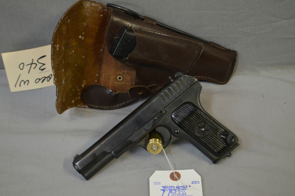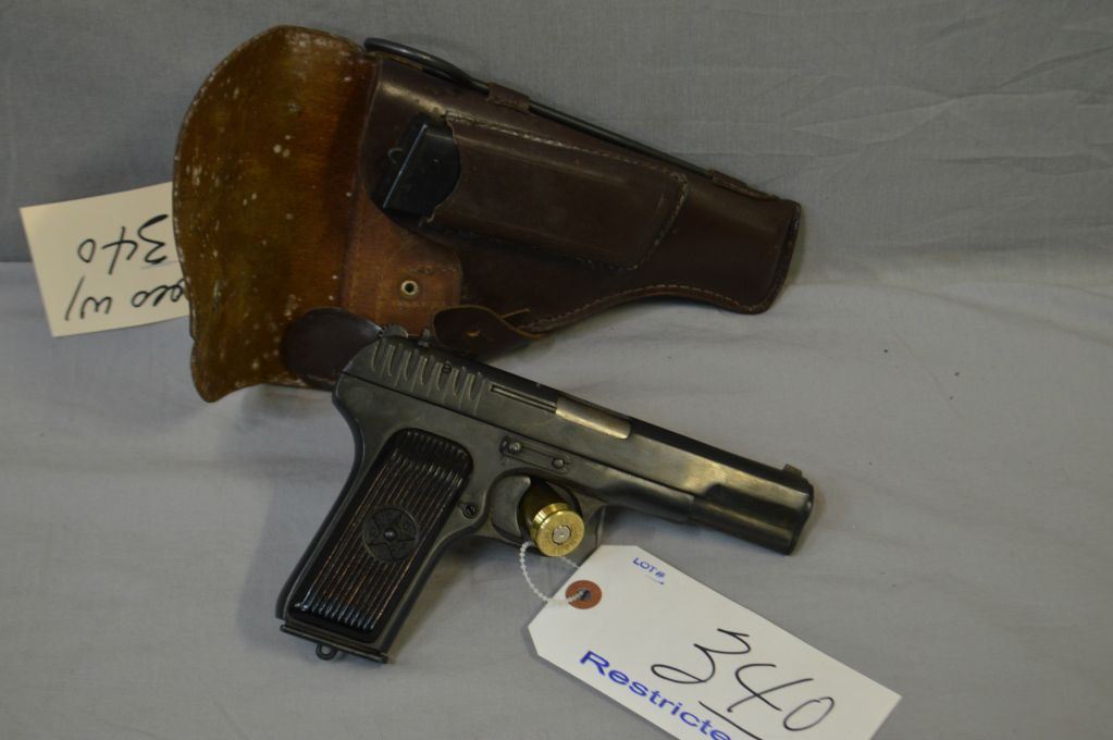 Tokarev ( Russian State Arsenal Tula ) Model TT33 7.62 Tokarev Cal 8 Shot Semi Auto Pistol w/ 115 mm bbl [ blued finish with some light pitting, CCCP insignia grips, stamped 1943, c/w extra mag ,both are stamped CK150 , c/w cleaning rod & leather holster that has some mold inside ] Ser # CK150 Restricted Handgun Cert # tci