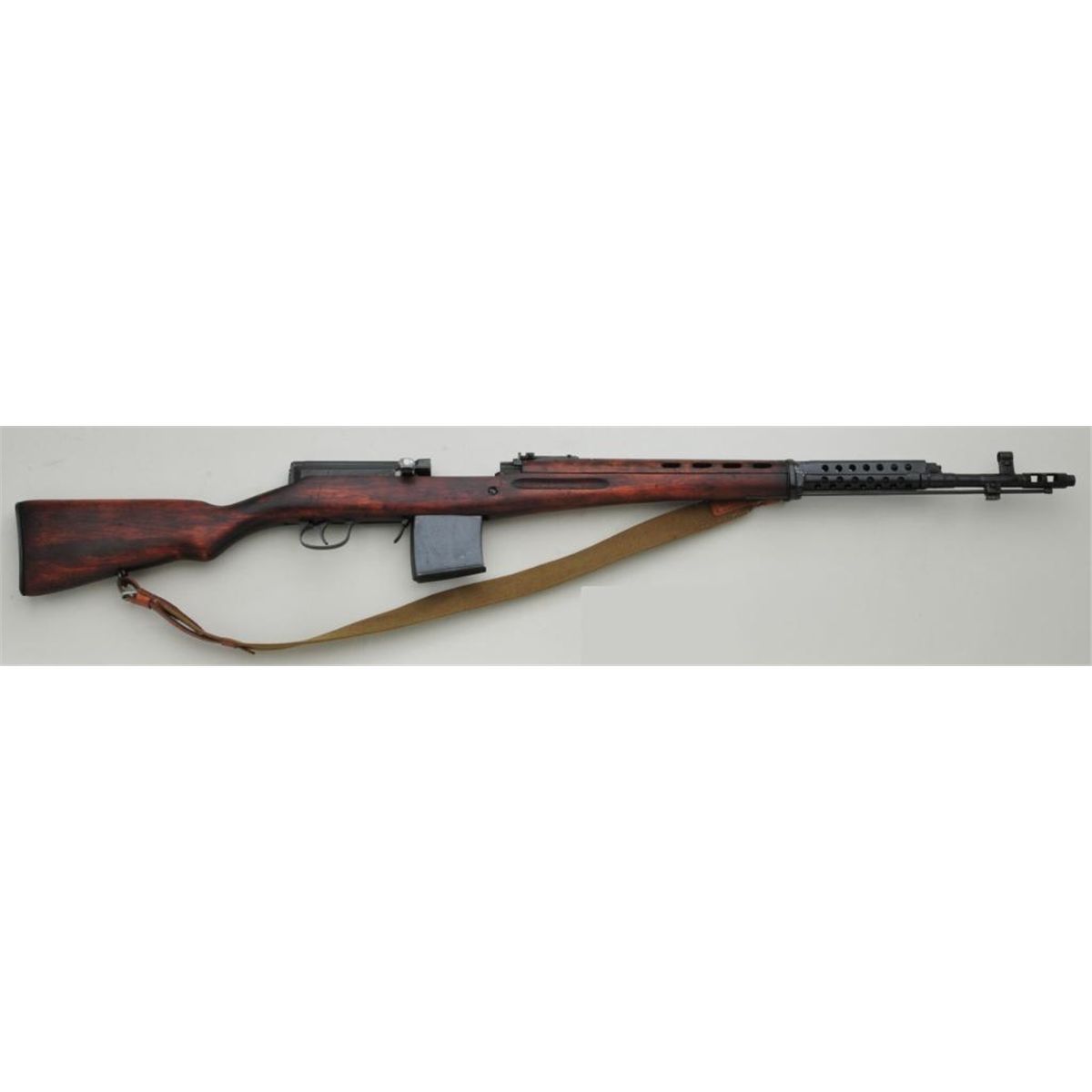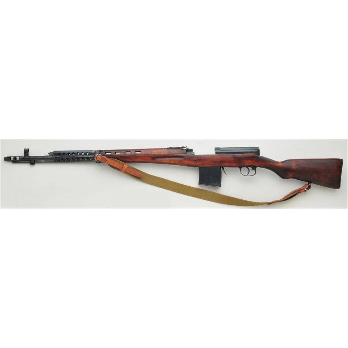 Tokarev model SVT-40, Tula Arsenal marked semiautomatic rifle in 7.62x54 caliber dated 1942. All matching serial numbers (except magazine), good to very good condition, showing 80-90% blue finish, many smallinspections at top of wrist, Russian type sling. Bore is full of dirt and grease and is at least fair to good, may clean. The best matching Tokarev we have seen in a long while. Est: $500 - $1,000