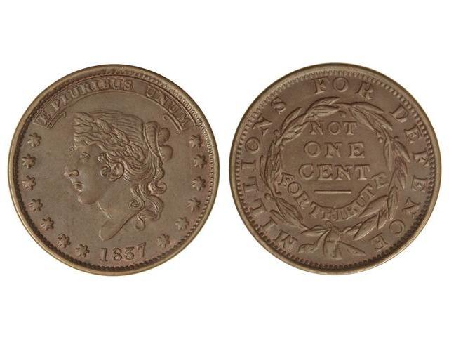 Token 1 Centavo. 1837. AE. Ø 28 mm. Leyenda MILLIONS FOR DEFENCE NOT ONE CENT FOR TRIBUTE. EBC.