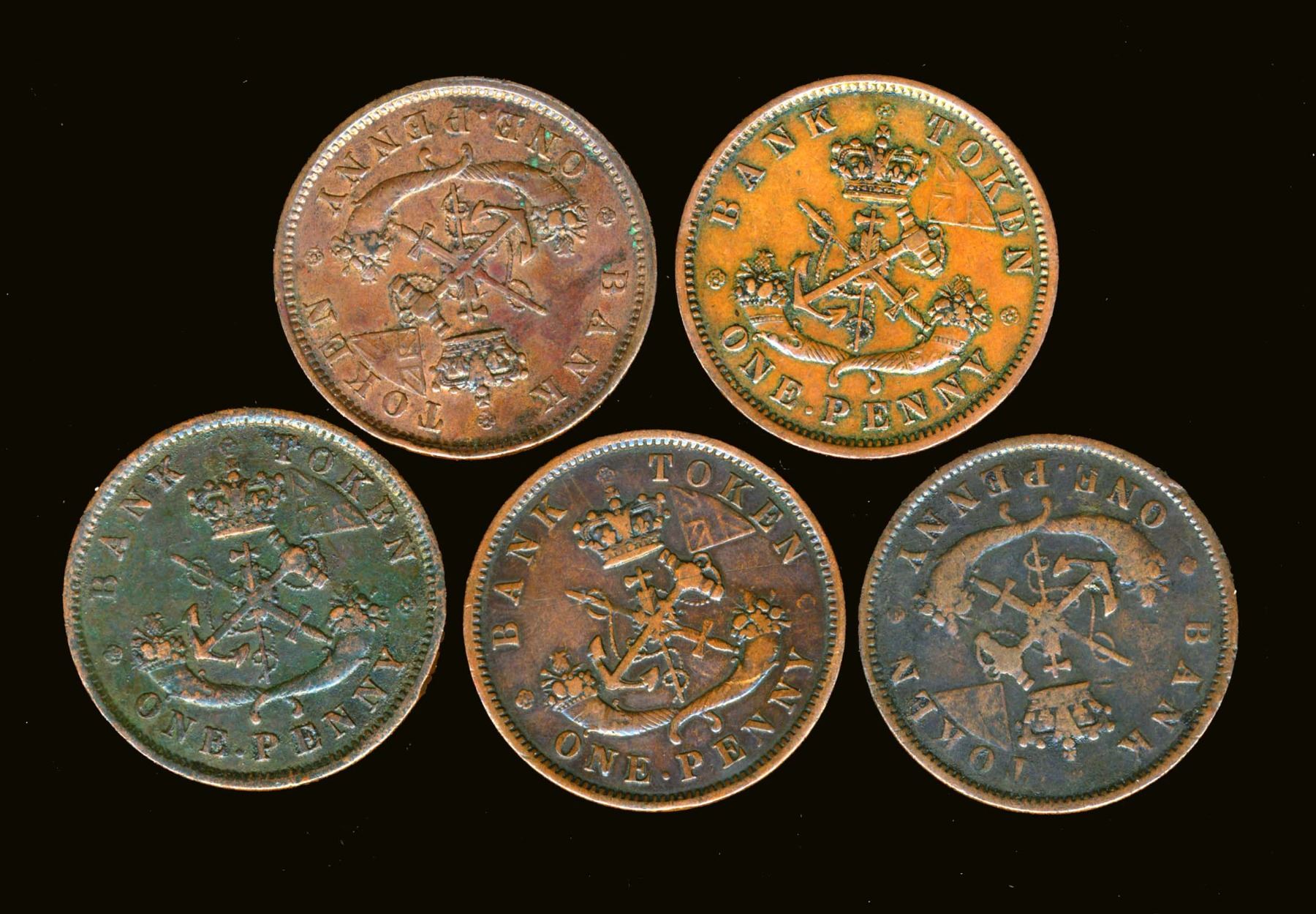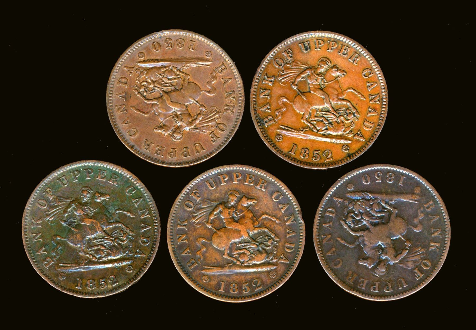 1 x 1850 PC6a1 EF, 1 x 1850 PC-6a2 F, 2 x 1852 PC-6b4 both VF & 1 x 1852 PC-6b4 Obv: Large long running die break EF