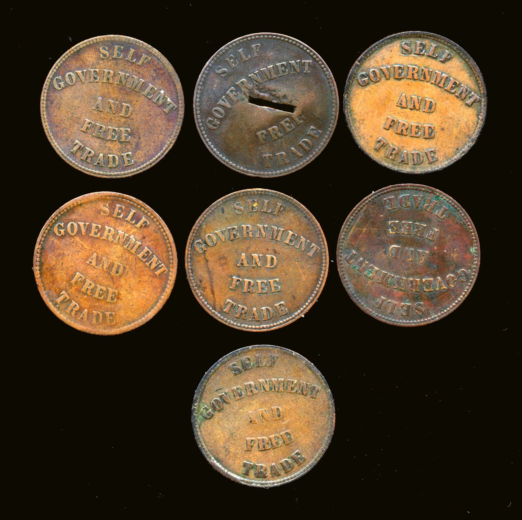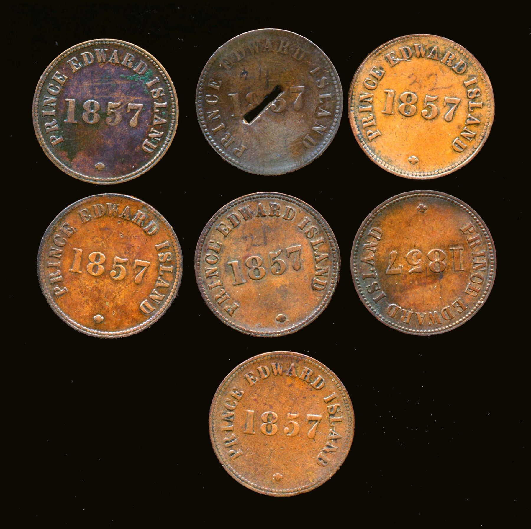 2 x PEI-50 a 5.0 gm. & b 5.1 gm., Co-19 F and VF, 1 x PEI-52 Co-21 5.6 gm, VF, 1 x PEI-54 Co-23 4,8 gm. 1 x PEI-60 Co-29 4.9 gm.(rev:Cud and defective beading), 1 x PEI-63 Co-32 4.9 gm. VF and 1 x PEI-65 4.9 gm holed.