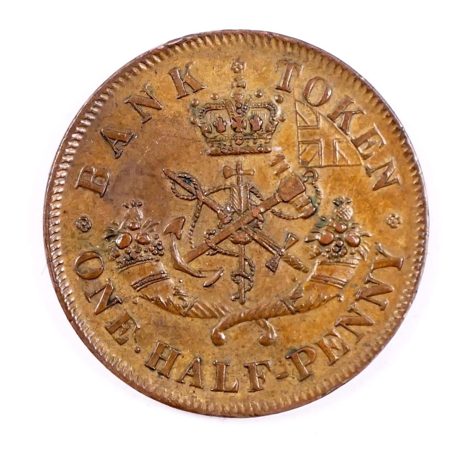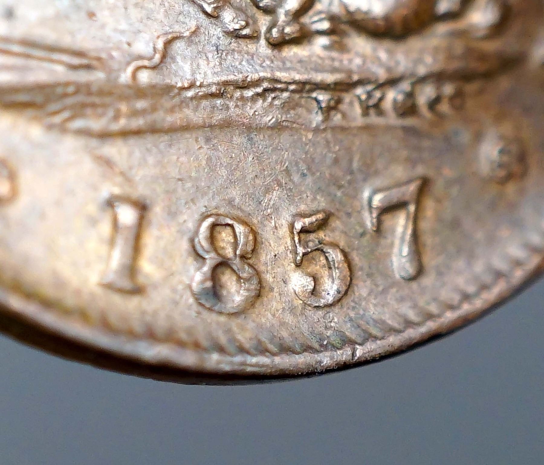 Obverse: Die break on NK in bank, from rim to PP in upper and re-cut O in "of", ADA & number 8 and 5. Reverse 2 dots and bottom leg of the E in one.