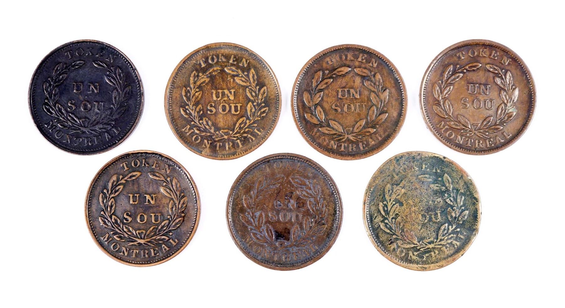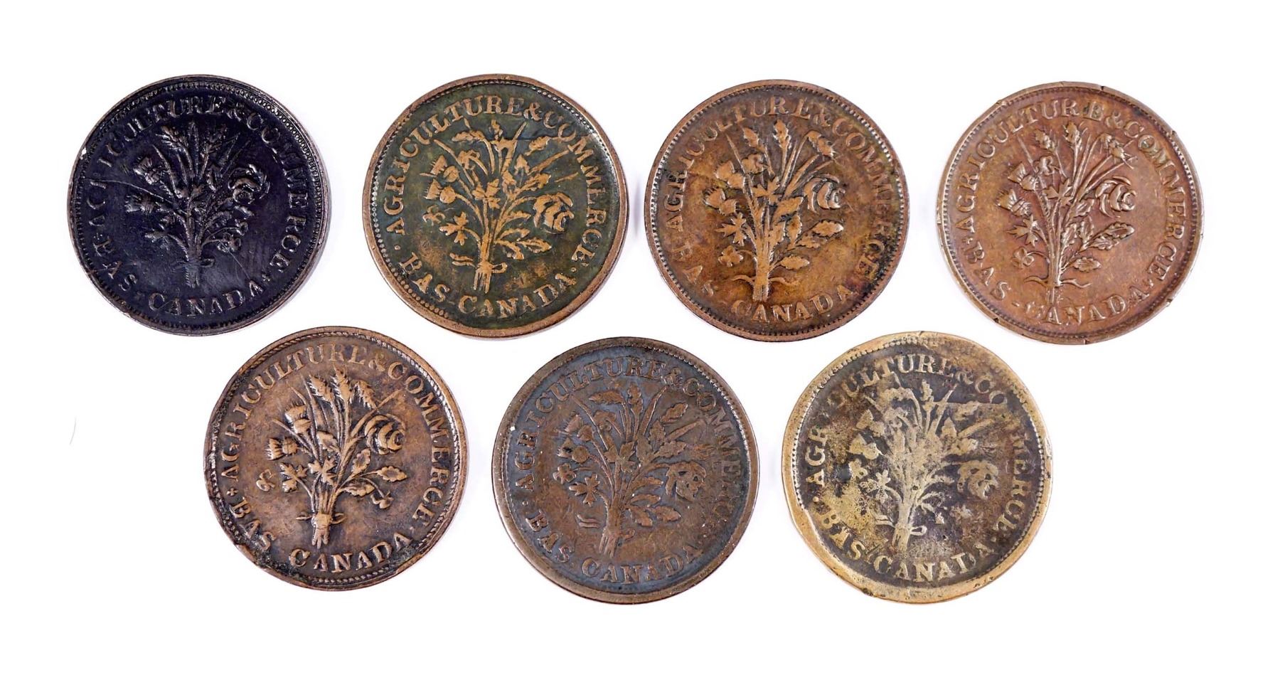 An interesting study group of a relatively common token but with die break characteristics. 2 x LC-29 w & w/o die breaks, 1 x 29B scarcer piece Co- 45 6.3 gm. F, 1 x LC-29c with 3 obverse cuds Co-32 7.0 gm VF, 2 x 29E1 Co-33b w/die break at 10 o'clock running across the coin 7.1 gm F and 6.9 gm w/o die break. VF.