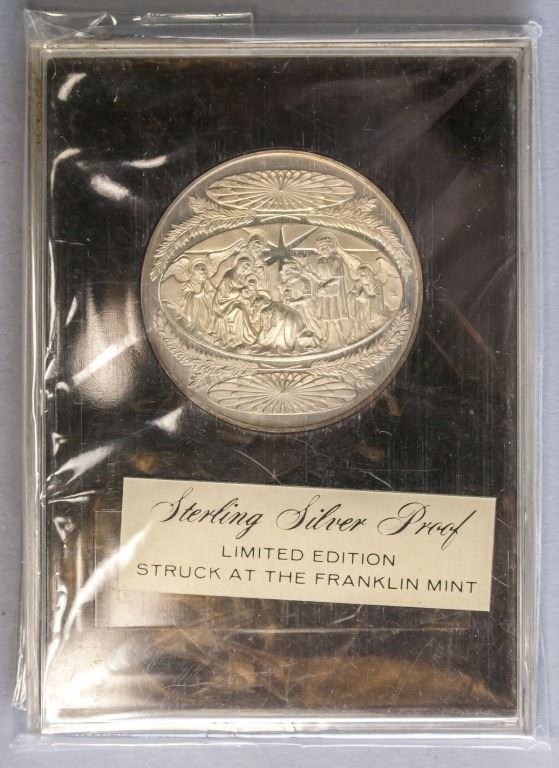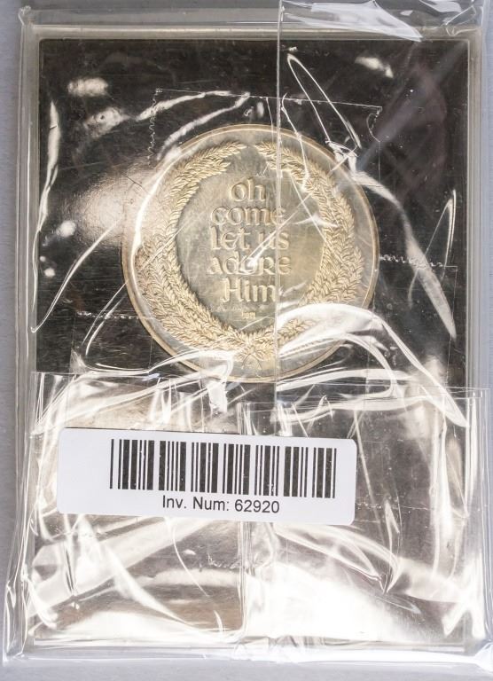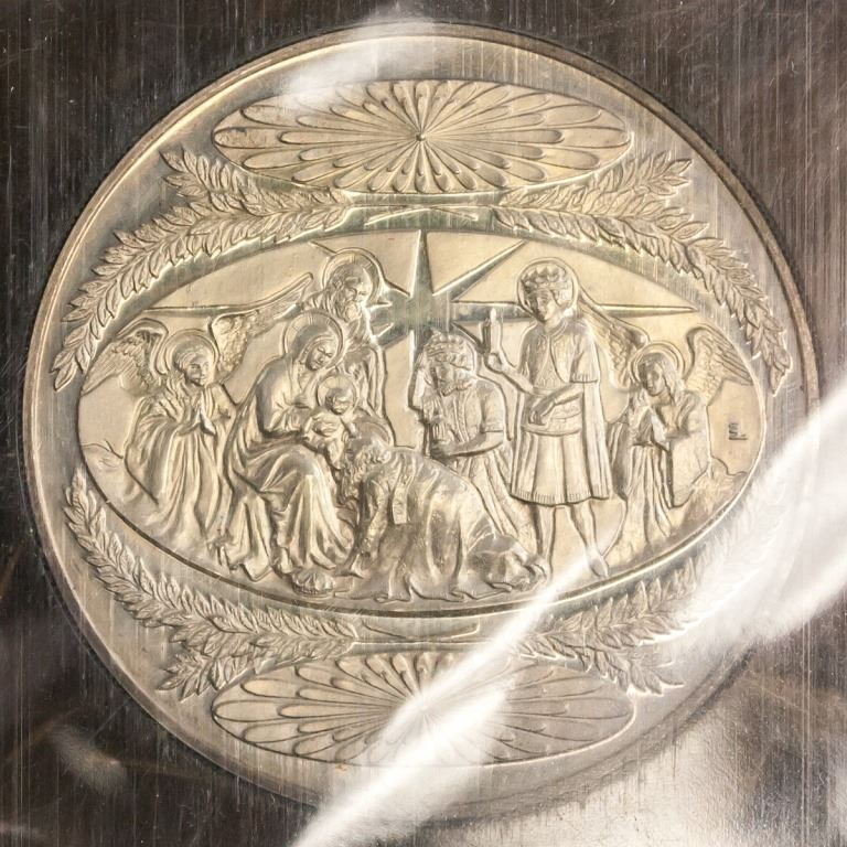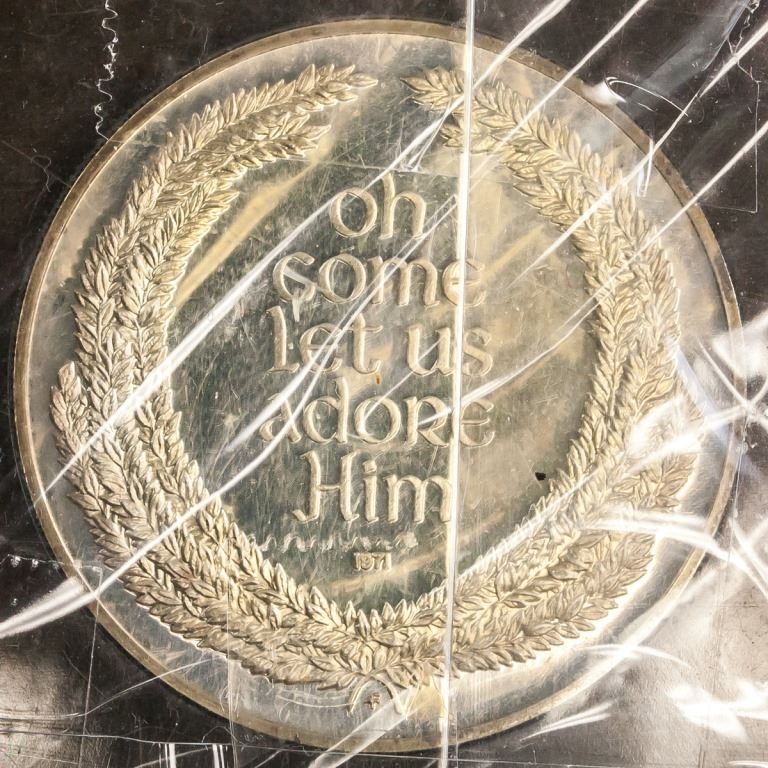 Token. Obverse: Birth of Christ. Reverse: Wreath with lettering in side. Lettering: oh Come Let us adore Him / 1971. Packaging reads: Sterling Silver Proof / Limited Edition / Struck at the Franklin Mint. 9 x 7 cm.