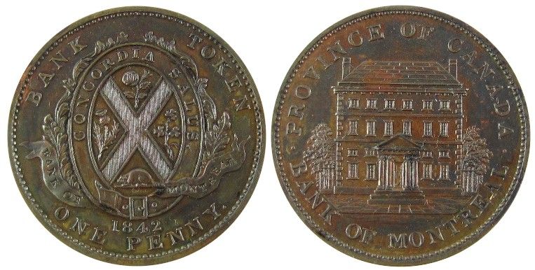 Token Br: 526, CH#PC-2B, 1842 Bank of Montreal. Proof Chocolate brown with light tint of red example. Charlton indicates proofs as existing but predominantly rare and Courteau attributes to this issue its own variety number, #76.