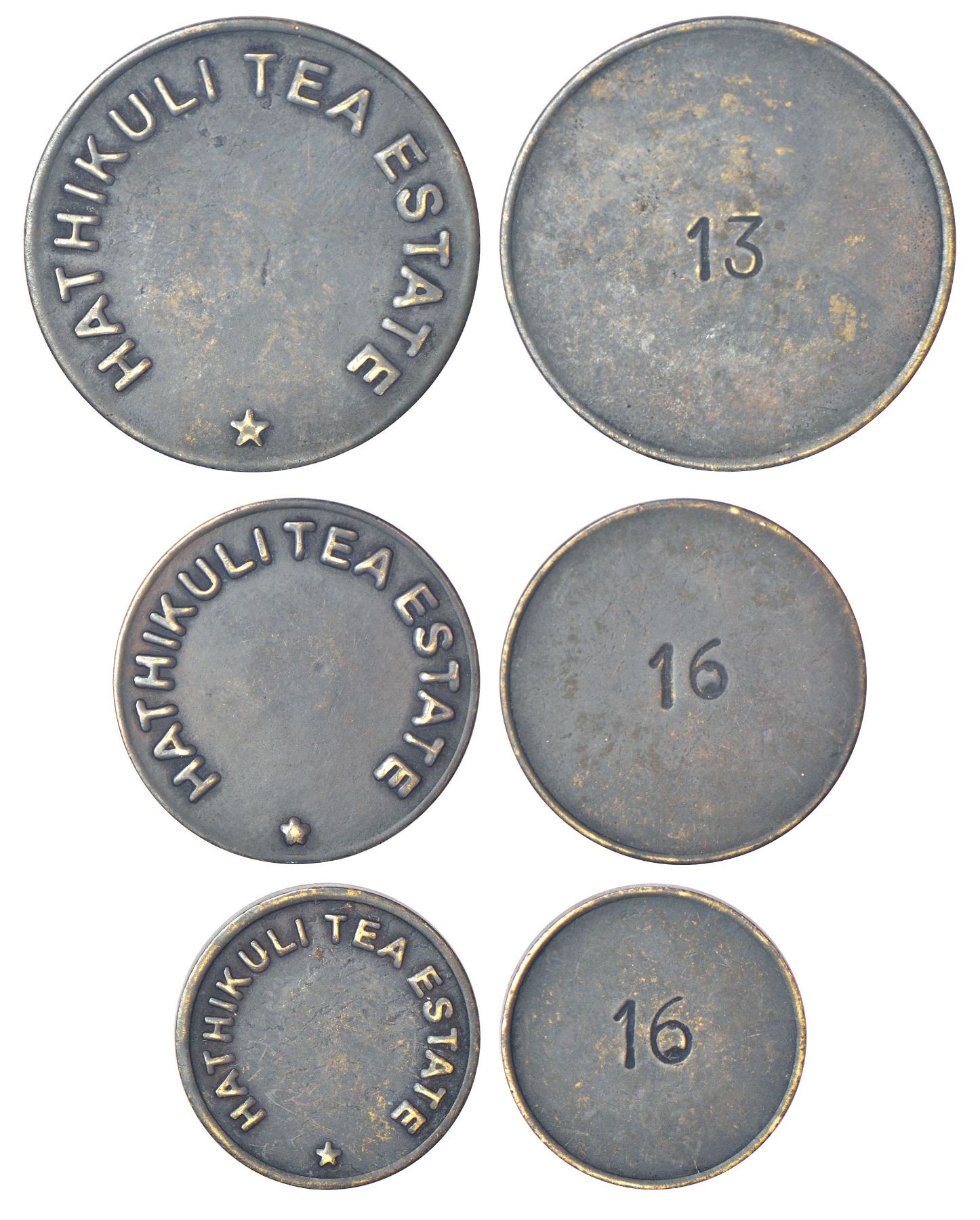 British India, Tea garden brass token of Hathikuli-Assam (3), not listed in PR, 11.42g, 7.67g and 5.74g. Obv: Lettering HATHIKULI TEA ESTATE. Rev: Numerals 13, 16 and 16.