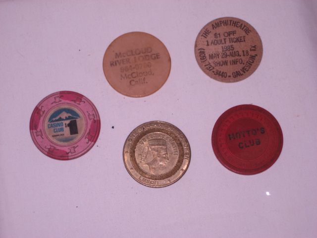 Saloon Clubs Poker Chips 1 Illegal Poker Chip “ MOTTO'S PLACE” - 1 McCloud California Lodge Wooden Drink Token – 1 Vintage Redding California Luxor Casino Coin – Hellow Dolly $1 off Wooden Token Adult Ticket “The Lone Star” The Amphitheater Tx