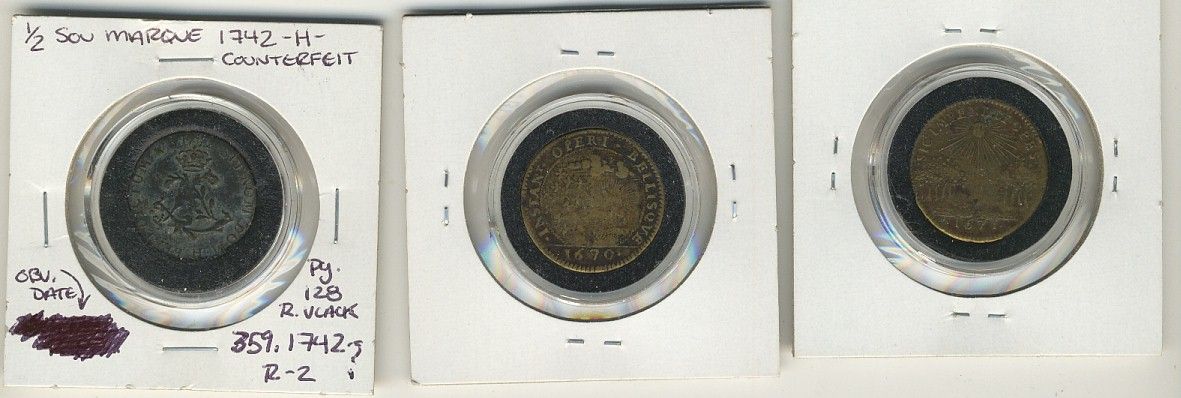 Token French 1670 & 1971 Jeton along with French 1/2 Sou Marque 1742-H Counterfeit issue. Lot of 3 items.