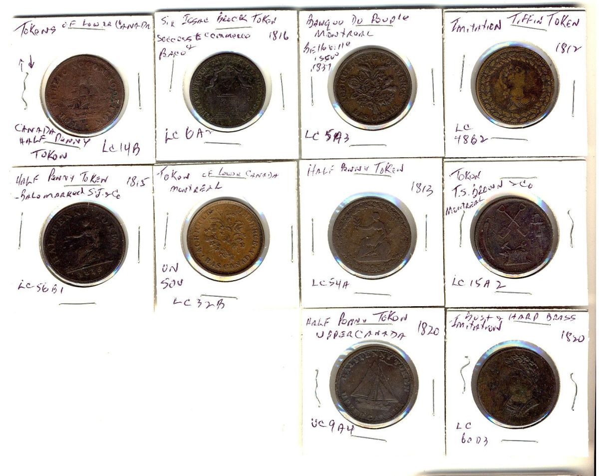 Token Lot. Bretons, Includes 10 coins including, Lower Canada (9) and Upper Canada (1) tokens. VG to VF with some corrosion on certain examples.Should be viewed.